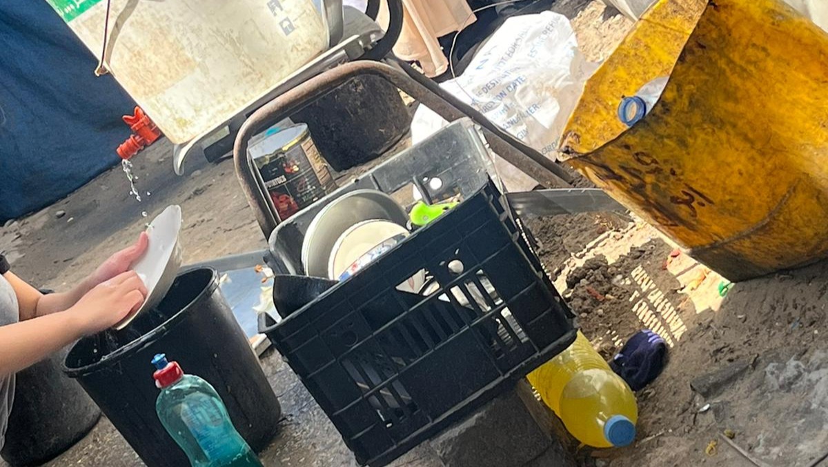To clean the dishes and other kitchen equipment, we bring water and place it in a big bowl like this one. We have endured long enough, and we are quite fatigued. Our bodies are now worn out and fatigued. Aid us