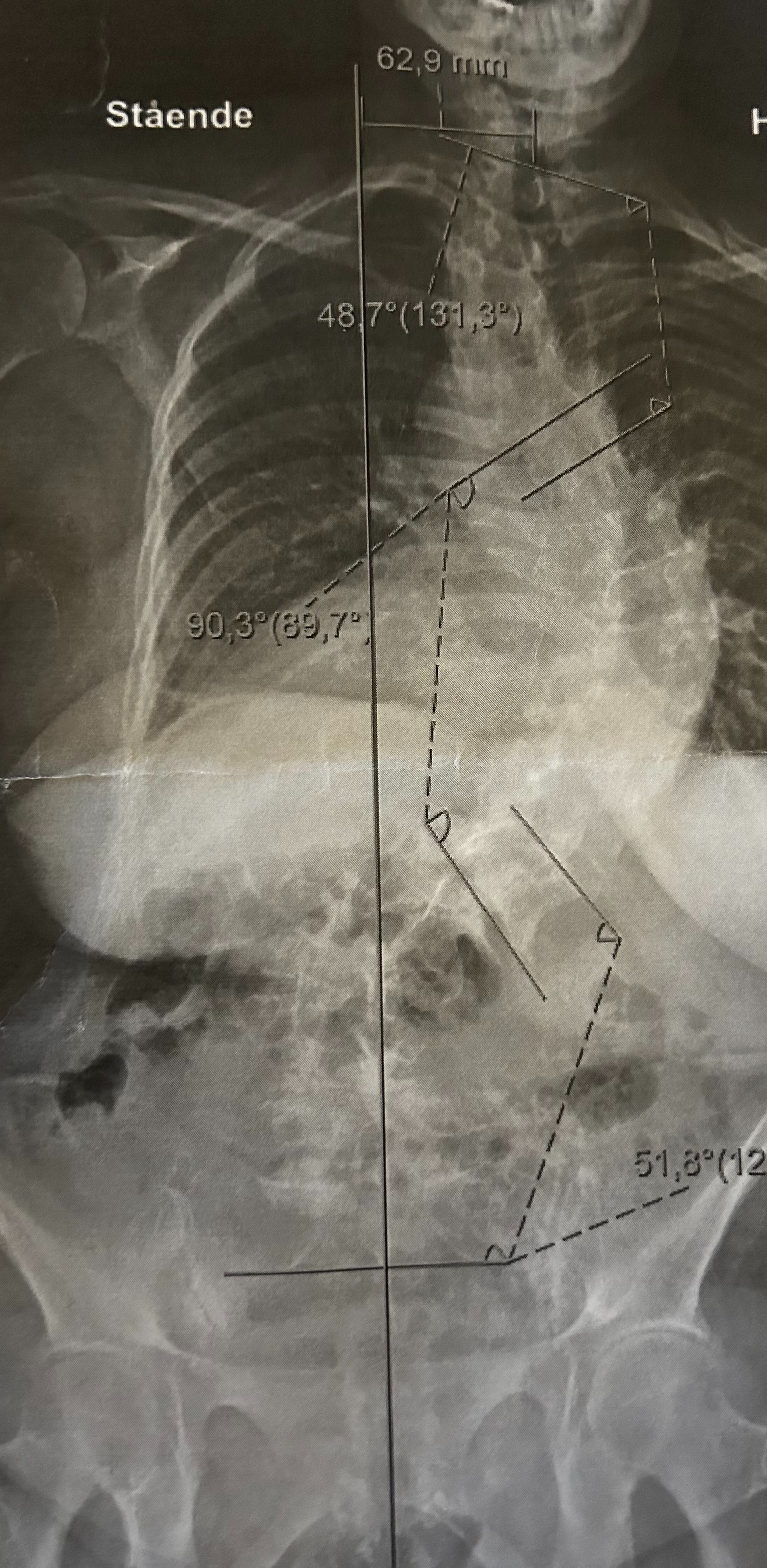 • Skoliosen: Som vist på bildet lider vår mor også av alvorlig idiopatisk skoliose. På bare tre år har ryggkrummingen hennes forverret seg fra 64 til 90 grader. Et helt sinnssykt fenomen. Som følge av dette er mulighetene for å bevege seg fritt blitt fryktelig begrenset. Hun er avhengig av krykke innendørs, og scooter for å bevege seg mer enn 30 meter utendørs. På grunn av alvorlig ME anses kirurgi i dag som for risikabelt (fare for at hun ikke kommer seg igjen, lammelse eller verre).