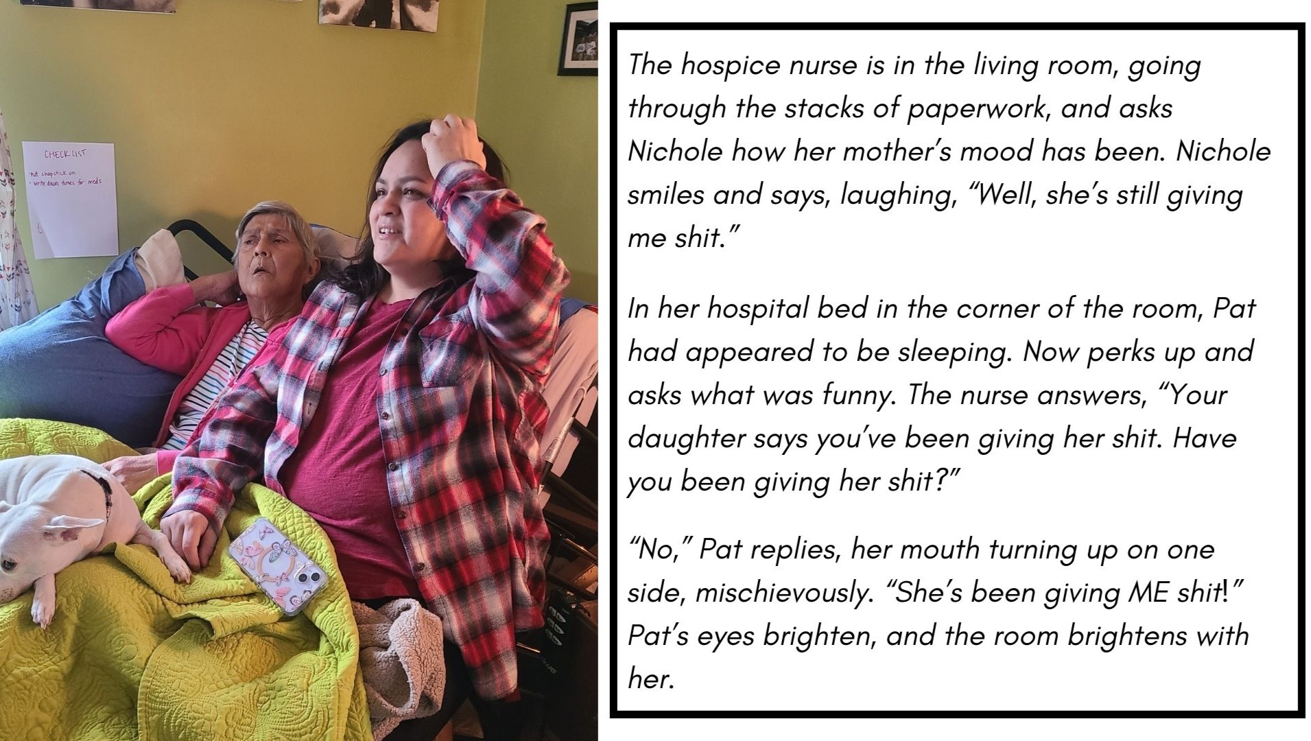 Nothing could force her away from her children before she was ready. With the support of a tight family, she's spent years fighting against cardiovascular disease, gastrointestinal pain, dialysis due to failing kidneys, and COVID (twice!). Now that she's finally ready to say goodbye to the physical pain and suffering, she's going to do it on her terms.