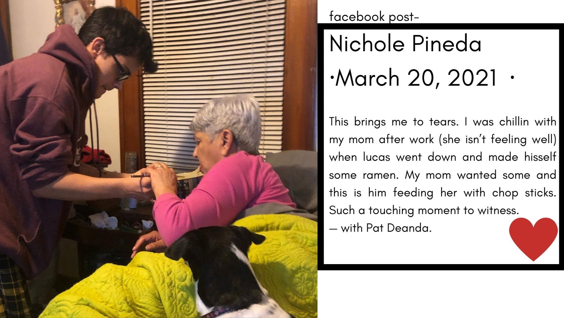 Growing up with 12 older brothers and sisters, Patsy Deanda knows the definition of family. She raised her children to be able to rely on each other. In the coming weeks, they’ll be facing lost income as two of her children, Marc and Nichole, and her grandson, Nichole’s son Lucas, take unpaid personal leave to provide the 24-hour care and company she needs. Pat has dedicated her life to her children, and wants nothing more than to spend her last moments in their hands, surrounded by their smiles, laughter, and companionship. They need your help to do this.