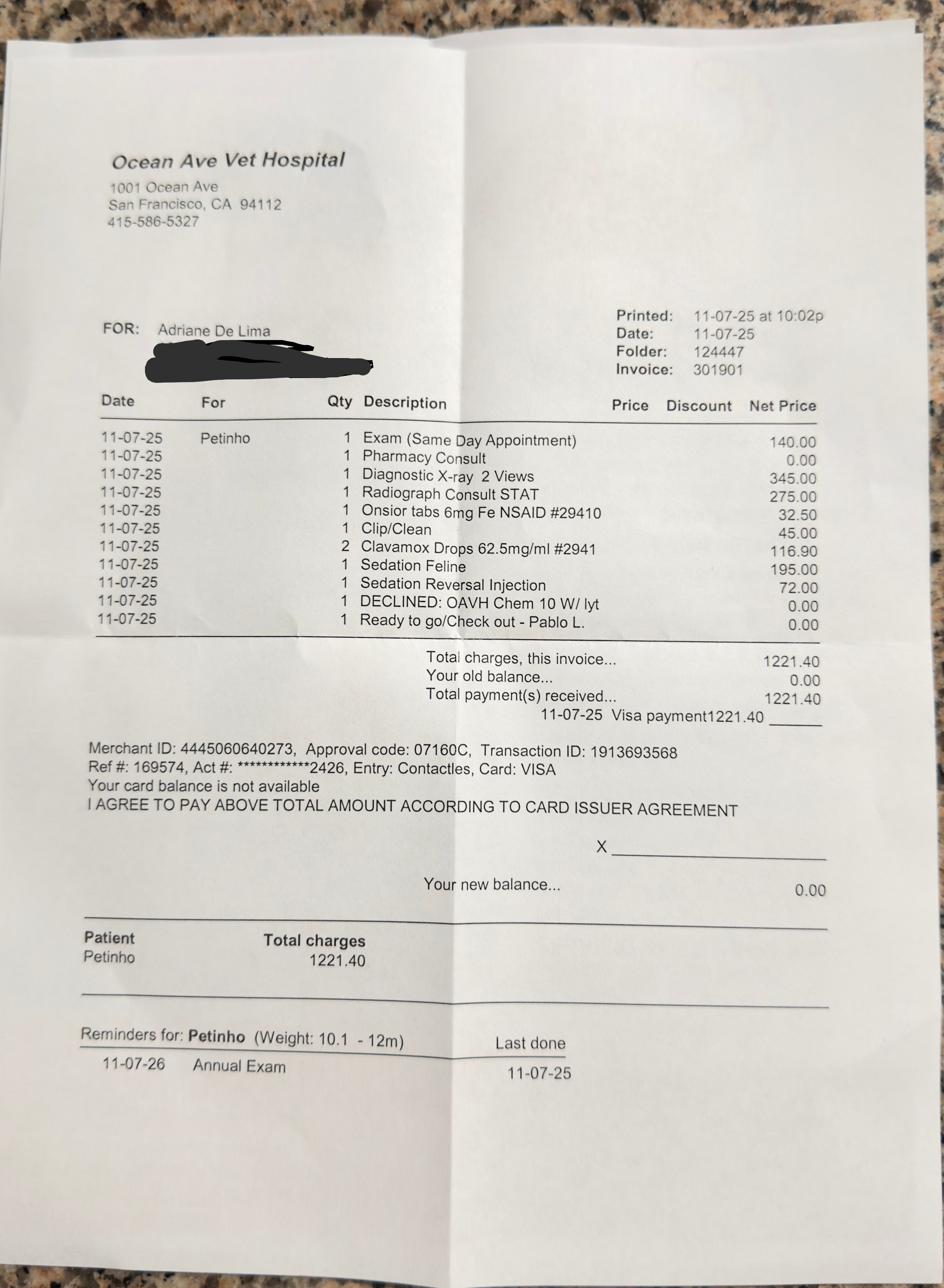 It took several days - longer than we wanted - but we were finally able to trap and rescue Petinho. Getting medical care for this stray kitty was the right thing to do - the only possible choice. We were lucky enough to be seen at Ocean Avenue Vet Clinic after being turned away by several other hospitals. Unfortunately, the bill at Ocean Ave. was astronomical ($1,221.40), and so we are reaching out to the community and hoping for a little bit of financial assistance.