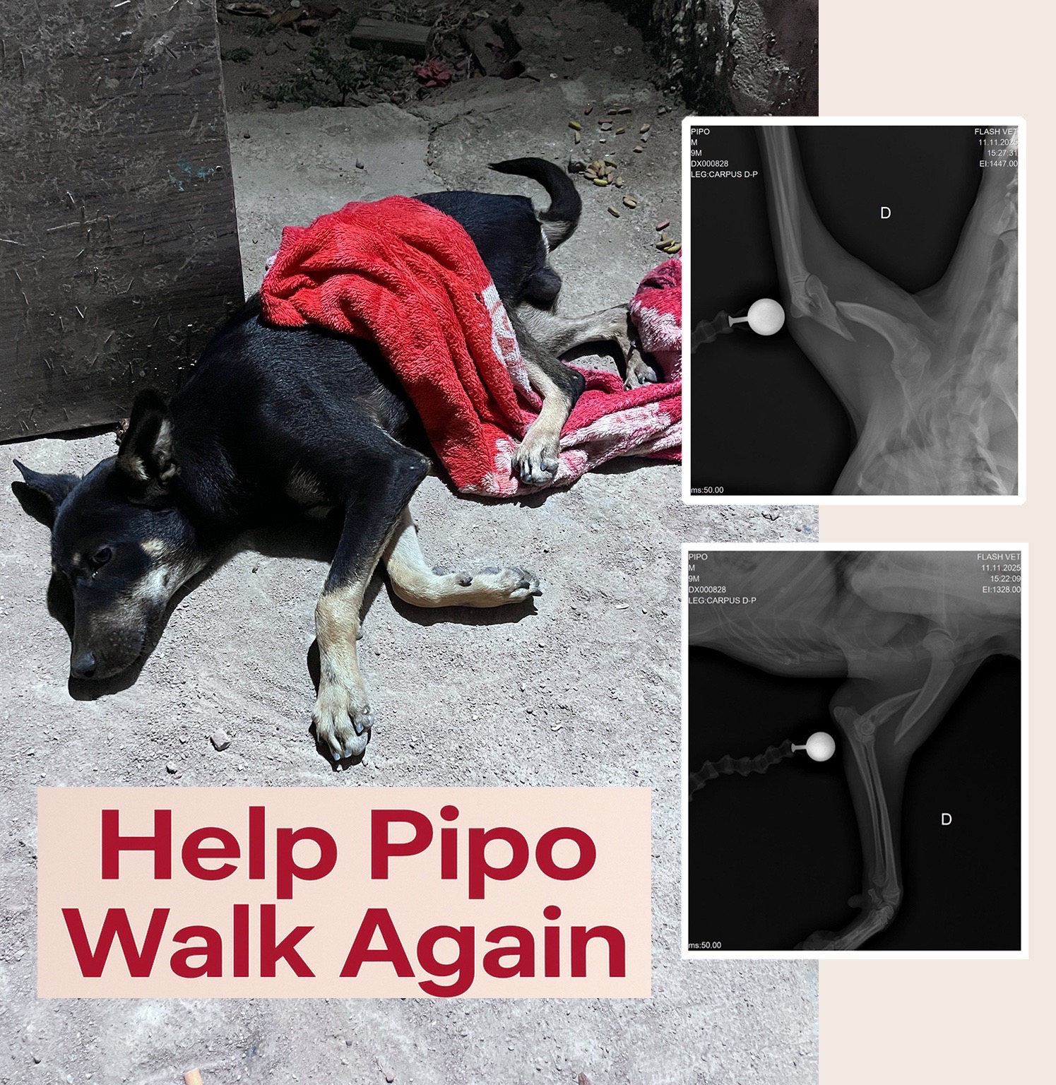 He’s currently fighting bravely — but one of his front legs is completely fractured, and there’s a possible fracture in his back legs too. He urgently needs surgery, more X-rays, and ongoing treatment to give him a real chance to walk and live without pain.