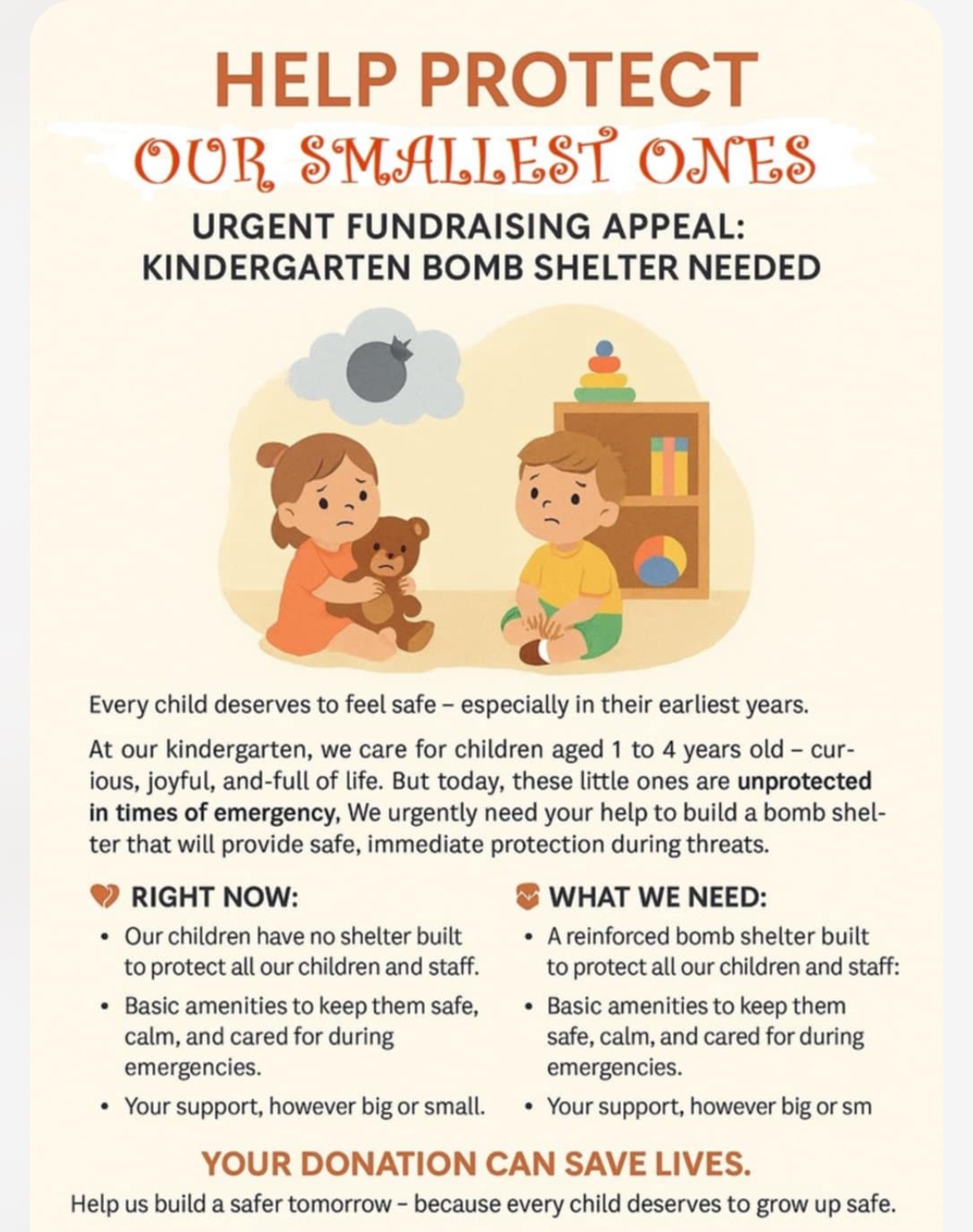 Your support will help us build a bomb shelter that will keep these precious little ones safe. A safe learning environment is vital, and we need to act quickly to make this possible.