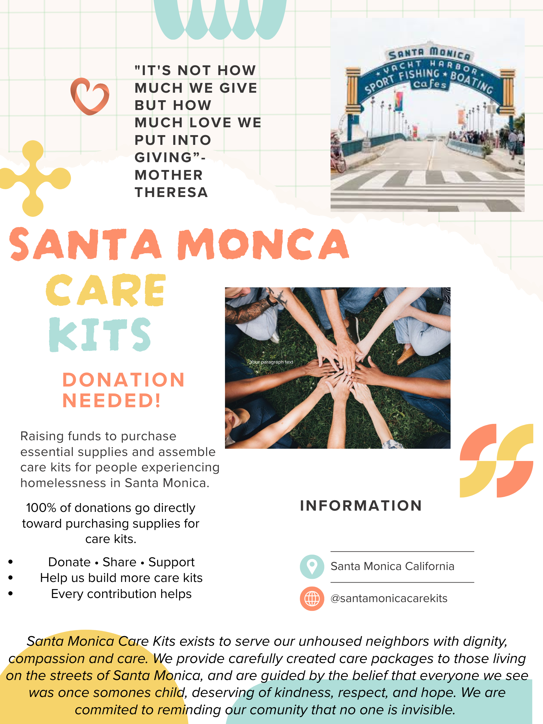 I created this GoFundMe to raise money to purchase the supplies needed to make these care kits. Every donation will go directly toward buying the items that will be placed inside each kit. Once the supplies are purchased, I will organize and assemble the kits so they can be distributed throughout the Santa Monica community.