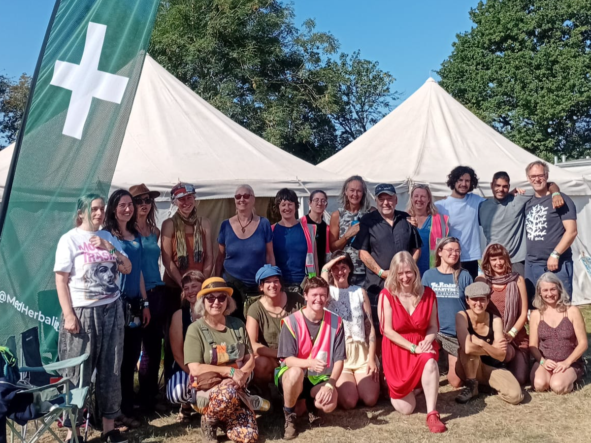 Dedj started this 33 years ago on her own and it became very popular as people who she treated found out first hand how effective herbs are for acute conditions and for first aid. After about 4 years she had to get help from colleagues. Eventually it evolved into a training clinic for students on professional herbal medicine courses where they get hands on experience and supervision. They are now a team that provides the first aid cover for festivals. Everyone has a minimum of a 5 day first aid certificate and they always have at least one paramedic and at least one Emergency Medical Technician . They often have nurses doctors and other conventionally trained medical professionals.