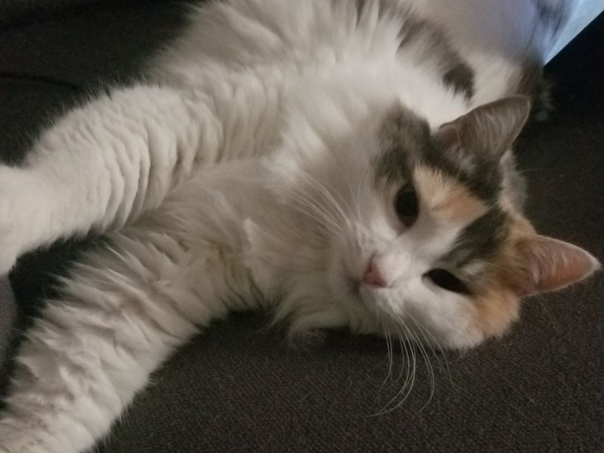 I'm a 12 year young gal in charge of my household. My favorite hobbies are asking for food, looking out the window, complaining in my protest box, tickling my nose with my twinkle balls, doing kitty puzzles to find treats, and gracing my humans laps and laptops with my presence. I go on walks with my humans, too! I like smelling everything and rolling around.