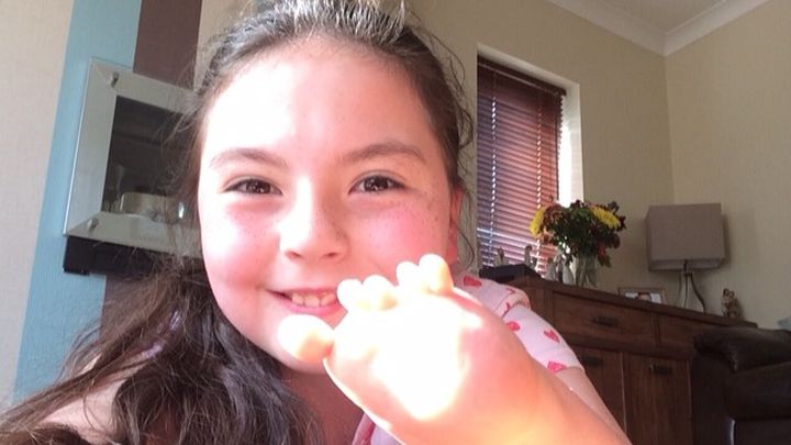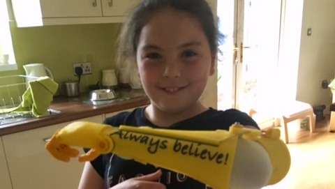 In late 2018 early 2019 we contacted TeamUnlimited run by Steven Davies, we saw the work that they did making 3D printed hands and we got in touch to see if it was possible for me to have one. I soon got one and the arm was made in my favourite colour yellow and had my motto ‘Always believe’ printed on it. I loved the hand but sadly my arm grew too big for it. I really liked it but the fingers couldn’t move individually so I couldn’t quite make my hand look like a love heart or a thumbs up shape.