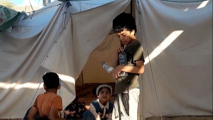 Hello my dears, I am Hiba Qishta from Gaza, a mother of three girls and three boys. We are now living in difficult circumstances. I live in a tent with my husband, my children, and my husband’s family. More than 50 people in the same tent, without any basic necessities for life, one bathroom for everyone, and the temperature in the tent. More than 38°, and insects and scorpions are spread everywhere, and I fear greatly for my children from the spread of diseases, especially hepatitis A.