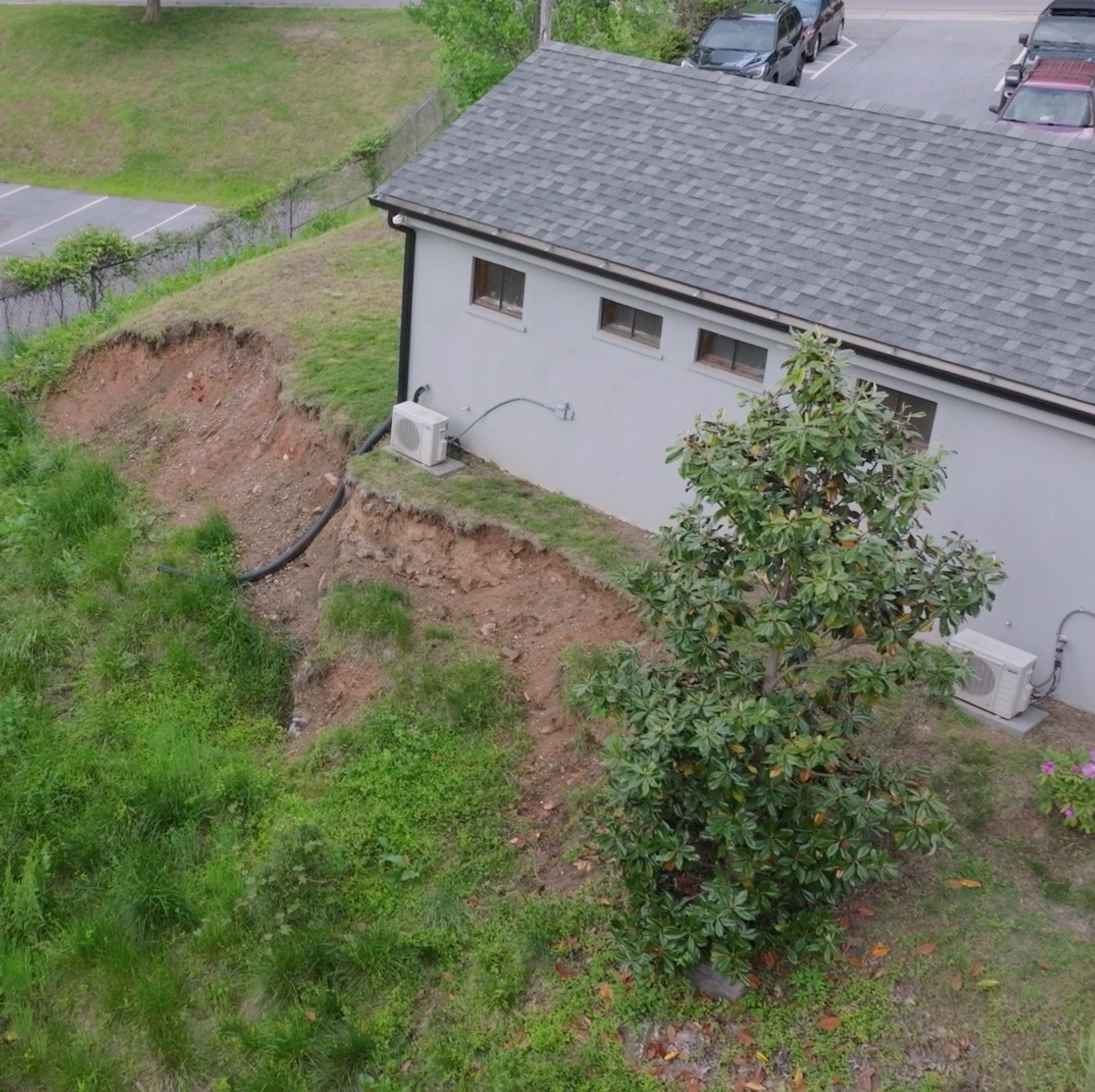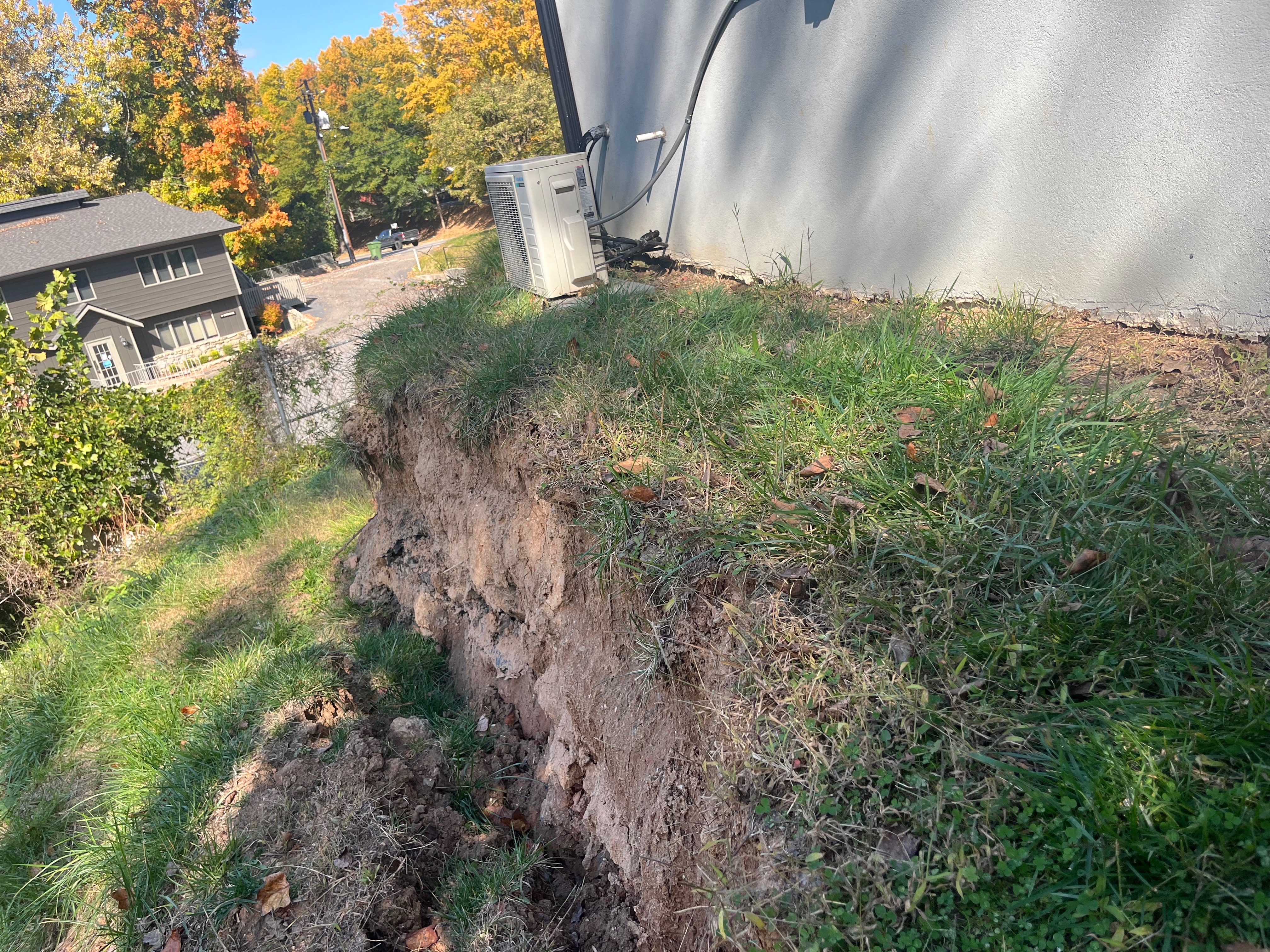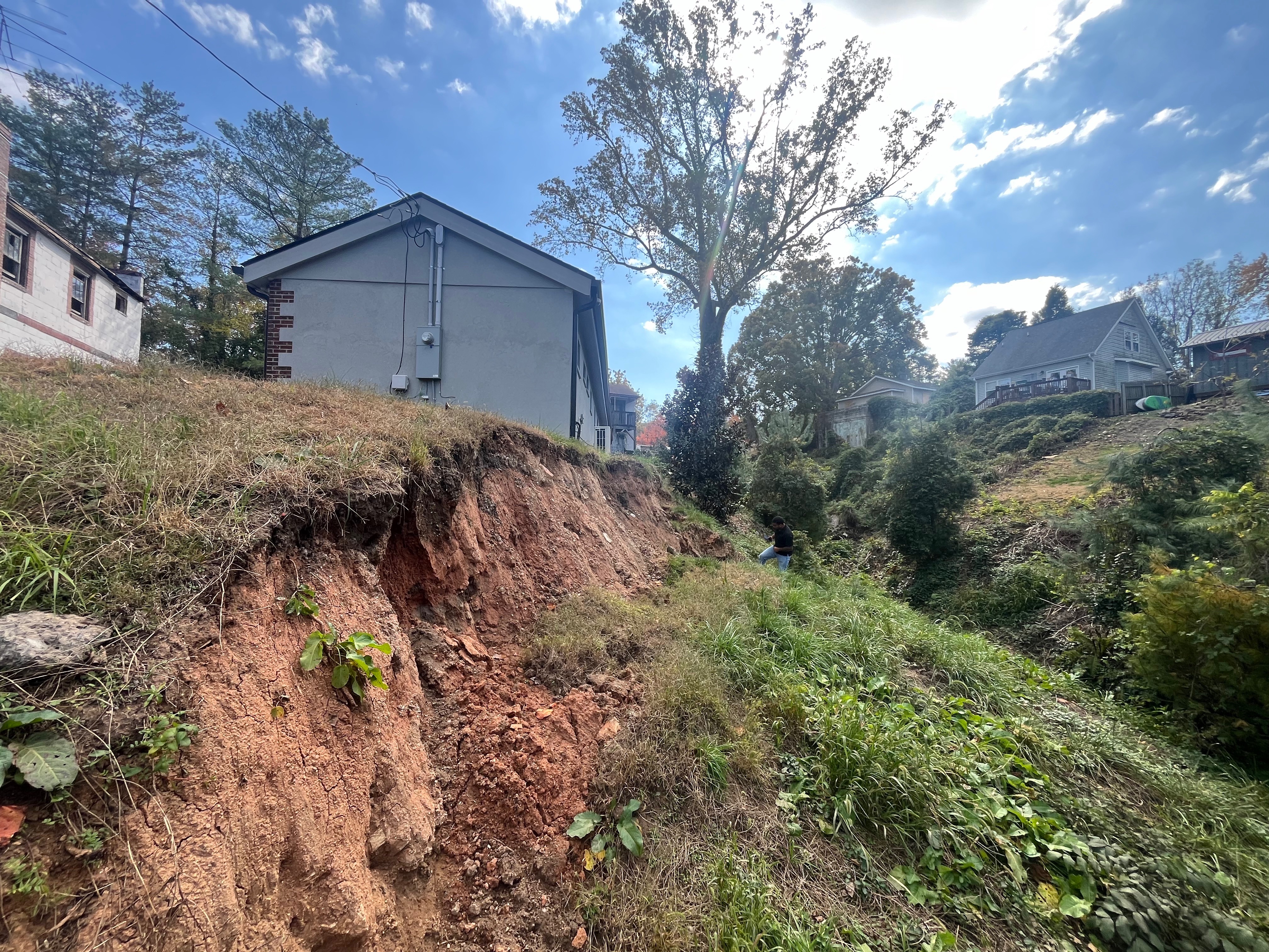 The storm brought our business property damage in the form of landslides, leaving an long escarpment and drop off up to within a foot of the corner of our building, dangerously threatening structural damage to the building foundation.