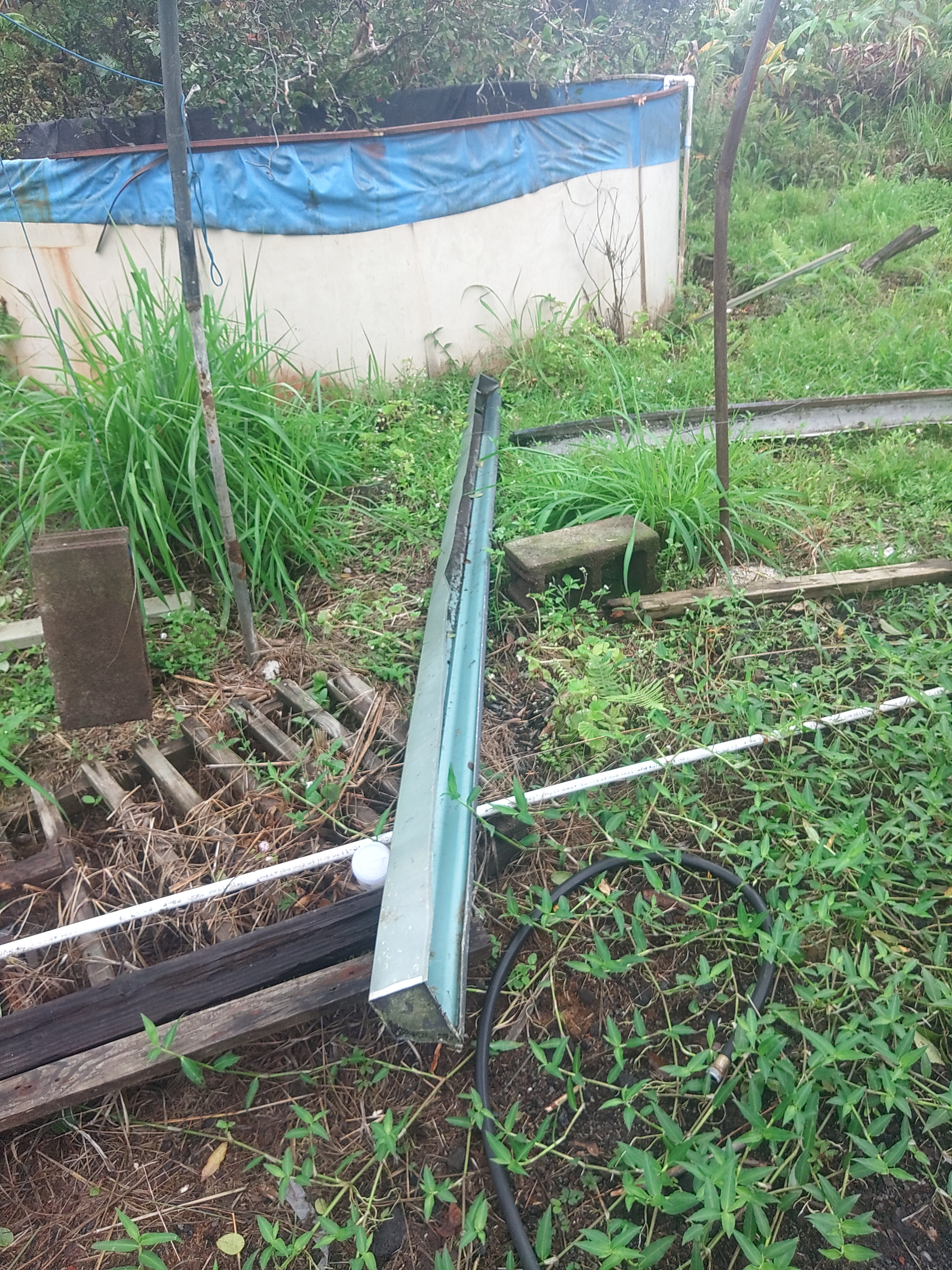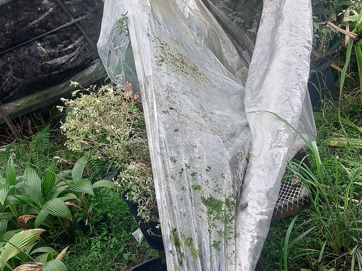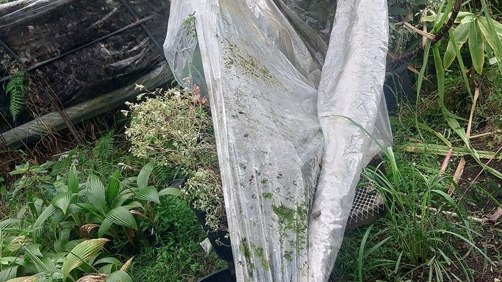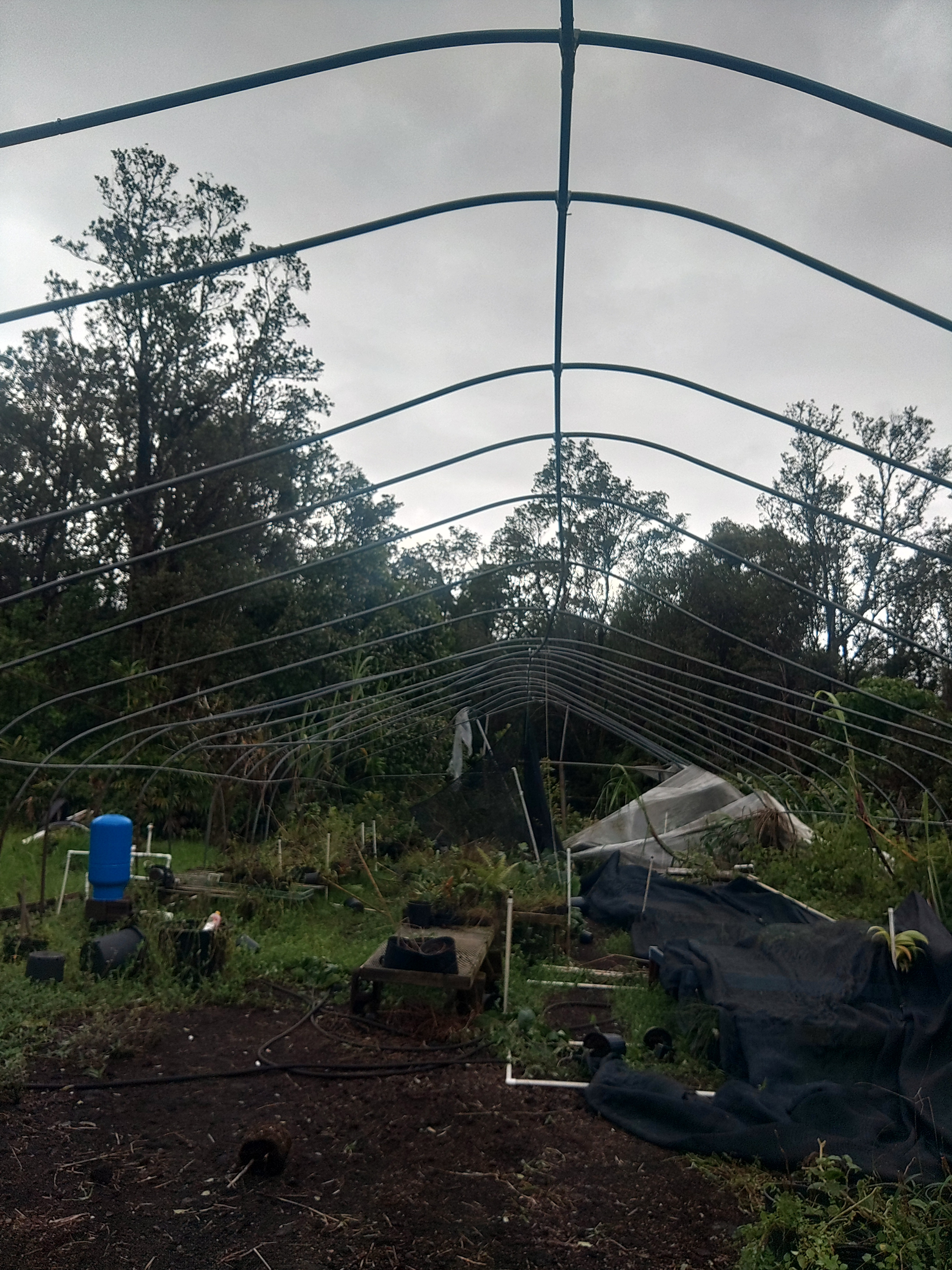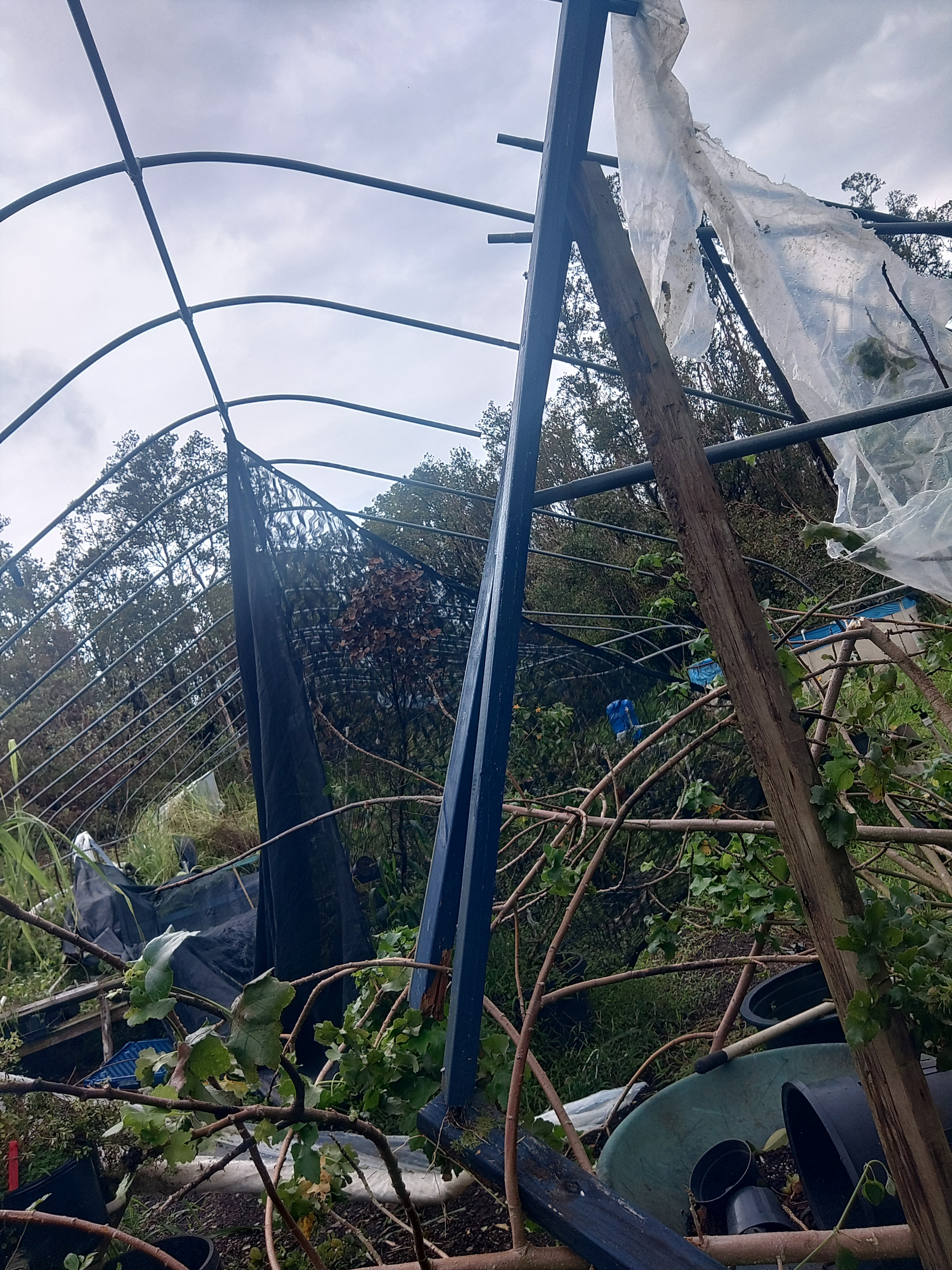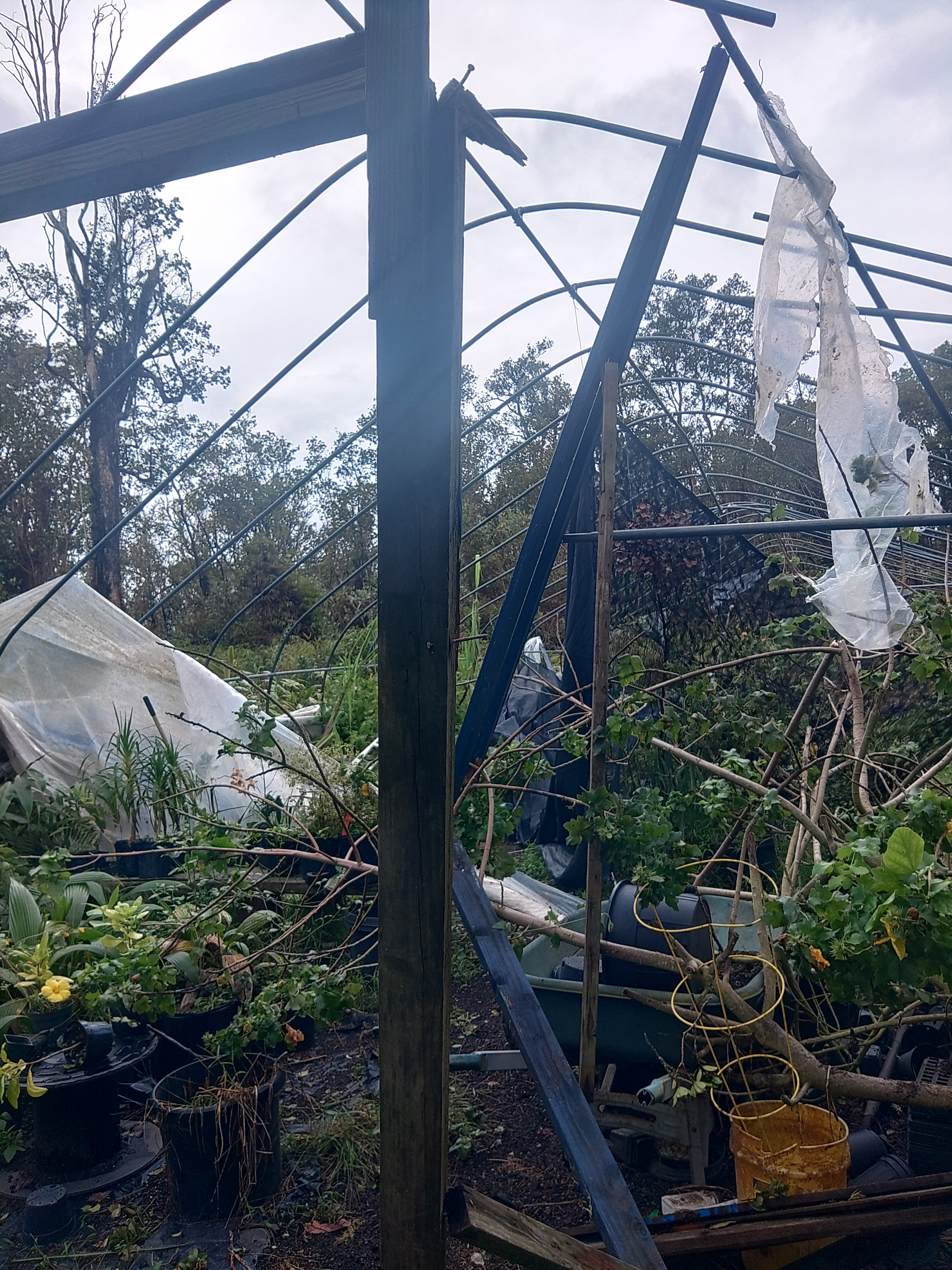 We live in a rural neighborhood, and when the storm came through, the high winds tore the plastic that covered the greenhouses and the gutter systems that we use for the water catchment system. Many of our plant racks were destroyed due to the heavy downpour of rain after the high winds had torn the plastic from the greenhouses. And due to the excess rain and wind, we have had our share of fallen trees that have damaged the frames or hoops of the greenhouses.