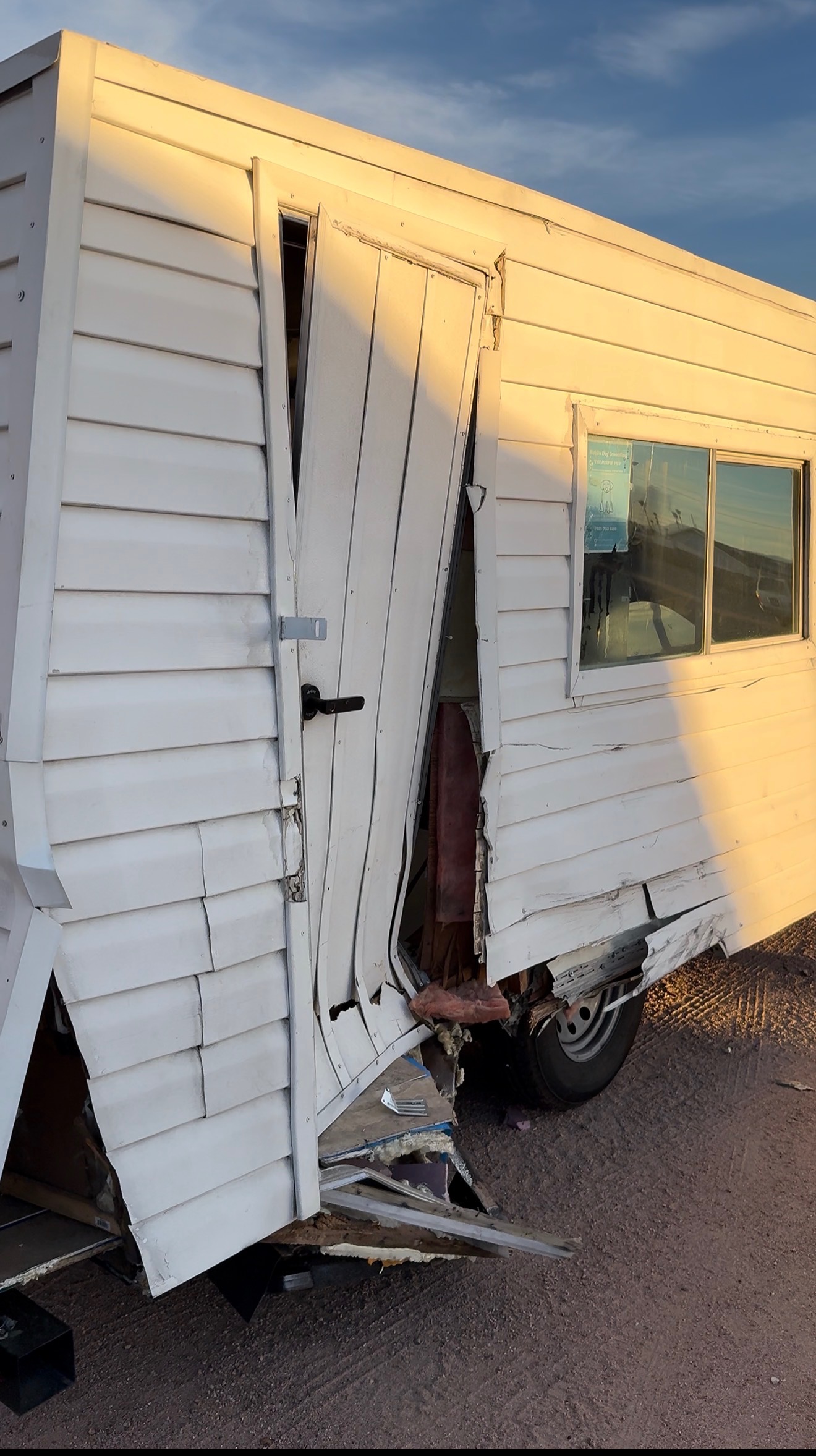 Last night, on March 22, 2026, a pickup truck was being reckless in a dirt lot near our house, doing doughnuts. The driver lost control, hit our trailer, and then fled the scene. Unfortunately, we didn’t have insurance on the trailer, and the police haven’t found the person responsible yet. We’re already in debt from all the time and money spent building custom features for the trailer, and now we’re faced with the possibility of having to start over from scratch.