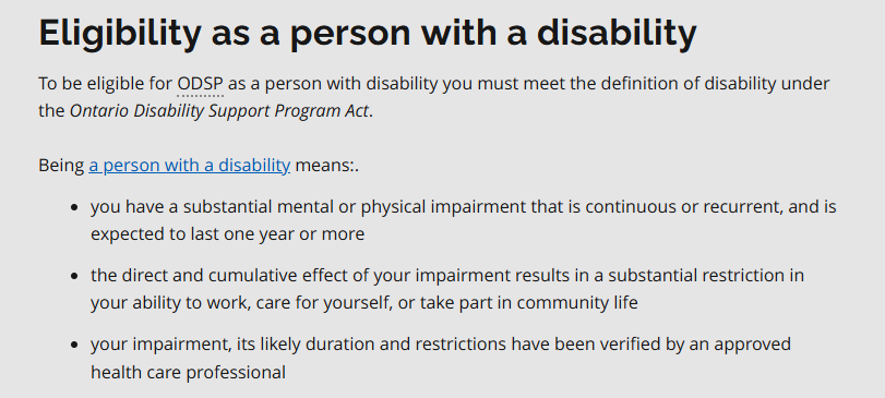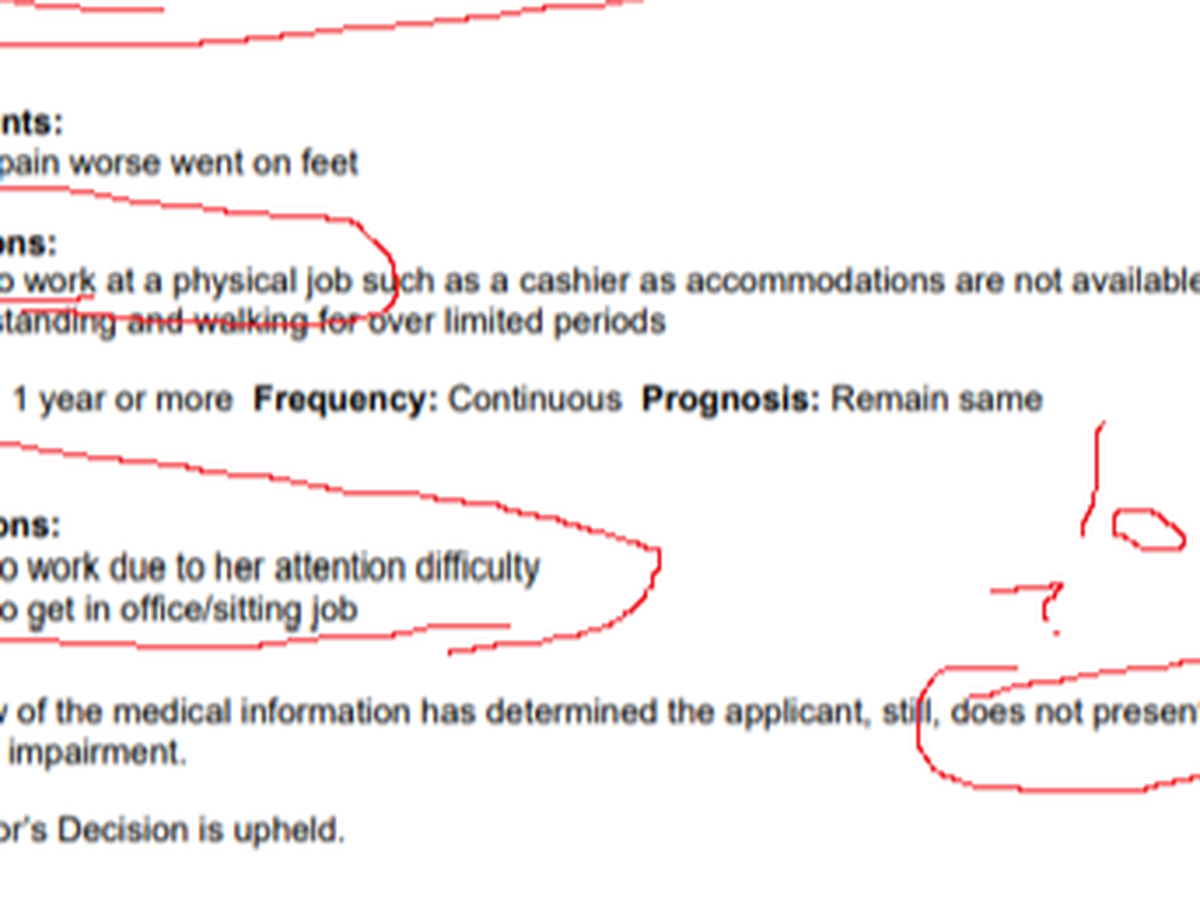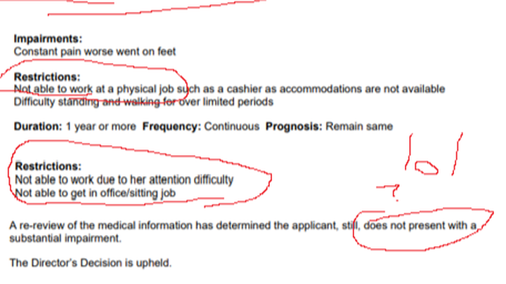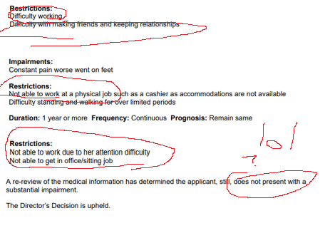 I already can't find any jobs that would accommodate me, which is why I applied for disability as I mentally and physically cannot work - I'm already dealing with the DAU (including being told by someone at the DAU that they deny almost every initial ODSP application because they "get too many") mishandling my case and forcing me to go to the Social Benefits Tribunal - I have to use a cane a majority of the time I leave my home, and I have several disabling enough physical conditions on their own, never mind combined - and I have several mental health disorders including both PTSD (off books but this is an error of my past psychiatrist) and ADHD/depression/anxiety (all medicated).