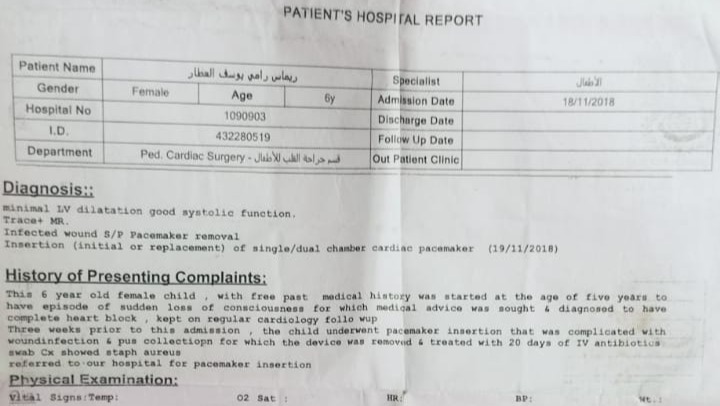Remas is 13 years old. She is a heart patient who suffers from a weak heartbeat. She underwent surgery outside Gaza to install a device that regulates the heart rhythm. Remas was 5 years old when she had the operation, and she now needs to replace the device’s battery. She suffers from severe pain in the area of the operation. I urgently need to travel to replace the battery. Our house in northern Gaza was bombed while we were inside it on 10/17/2023. I, my husband, my children, and Remas were injured that day. I came out from under the rubble. Some of my children recovered, but as for me, my cruciate ligament and the internal and external meniscus were severed. I need surgery as soon as possible, and I cannot walk on my feet because of this injury. Remus also entered a stage of constant fear and fatigue. Remus has a beautiful smile. I'm afraid that I will lose her, Remas and I desperately need your help, Remas needs medication and surgery, and I do too. As a simple family, we cannot afford treatment and travel expenses