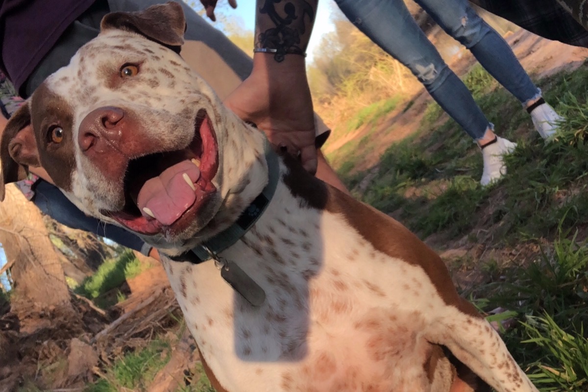 Hello you amazing people who take the time to read about my sweet baby cow. Remington is about 7 years old (from what we were told after adopting him 2 years ago) and is a pitbull/ german short hair pointer mix! We went to the north county San Diego humane society looking for a mini sized buddy for out extremely energetic husky/hybrid, but upon walking up to the shelter a woman worker was walking a dog back to his kennel.... he and I locked eyes and he immediately started pulling to come over to me. Apparently this wasn't in his nature to be so bold so we HAD to meet him. it took less than a minute for me to absolutely fall in love with him..we all fell in love.