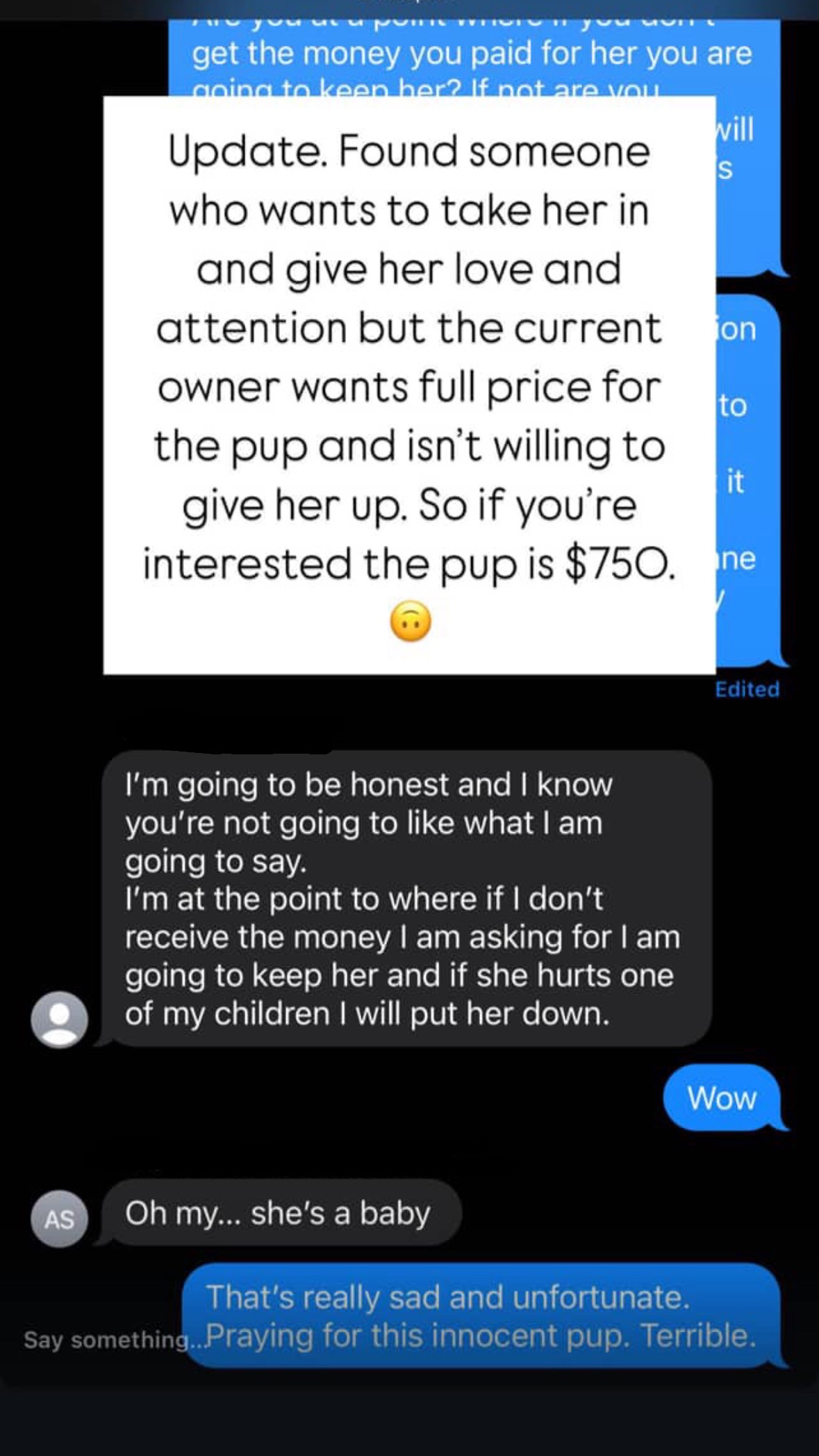 Hi, so my friend knows a woman who keeps her puppy outside all day with no attention and has given her no training. She adopted her irresponsibly and practically holding the puppy for ransom claiming the puppy has “hurt” aka scratched her child. She refuses to give the puppy attention or pay for training. The dog is outside all day in the Texas heat. We have found 3 great families willing to adopt but they don’t have the funds to pay the $750 to this lady. Putting this up to get this dog out of this ladies hands and into a forever family home before this psycho kills this poor puppy. I’m going to cover whatever is not raised but anything helps. $750 for the dog and throwing an extra $250 for the family that takes her in. Shots, vet visits, toys, food. Thank you! ❤️