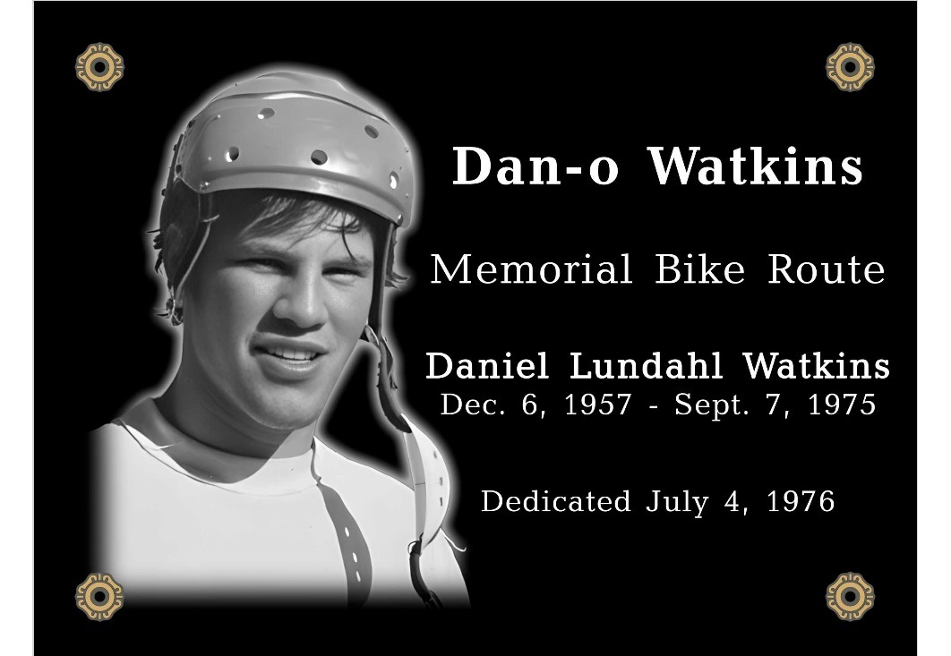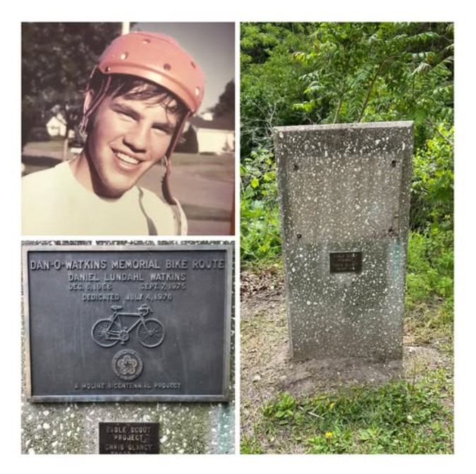 My name is Steve Lind. I was one of Dan-o Watkins's best friends in high school. One of several passions we shared together was bicycle touring. This was back in the 1970s, when the popularity of 10-speed bikes for adults was just gaining a resurgence. In 1974, in our junior year in high school, Dan and I proposed a comprehensive bike route throughout the city to the Moline City Council. This was later approved with funding for sign markers and improvements on dangerous storm drainage grates for bike riders. Dan and I continued on weekend and overnight bike tours with his father and high school friends. In 1975, our senior year, Dan heard about a 4,000-mile cross-country bike tour across America being organized for the Bicentennial in 1976. We promised each other we were committed to undertaking this adventure. But first, we needed to graduate and take one last 3-day bike tour before Dan headed to Colorado that summer, where he taught at a mountain climbing school. We kept in touch through letters that summer, planning another bike tour when Dan returned in September. Tragically, a week before returning home, Dan died in a mountaineering accident. Everyone was in total shock when they heard the news. Dan-o was our class president in high school and one of our class's most popular and beloved members. The loss was unbearable, especially to Dan's family, which had four sisters. The following year, an Eagle Scout erected a monument with a bronze plaque along the route at Riverside Park, dedicated to the Dan-o Watkins Memorial Bike Trail. For 49 years, the monument stood as a reminder of Dan-o's effort in making this bike trail a reality. Sadly, last year, a rogue metal scrapper tore off this plaque along with other metal plaques along the Butterworth Parkway, selling them for cash. Replacing the bronze plaque today is cost-prohibitive and subject to similar potential theft. The polished black granite replacement allows for the etching of Dan-o's face, which has little value for potential thieves. This August, the class of 1975 will be celebrating its 50th reunion, and plans would be to rededicate this on its original monument that weekend. This is the only marker recognizing Dan since he was cremated and his ashes were spread in the mountains of Colorado. I can secure this granite plaque at wholesale through my brother, who is in the funeral industry. The money I am asking for covers the production costs of the plaque, shipping, and installation. I did complete that bike tour across America in 1976, along with a photo of Dan-o in my handlebar bag.