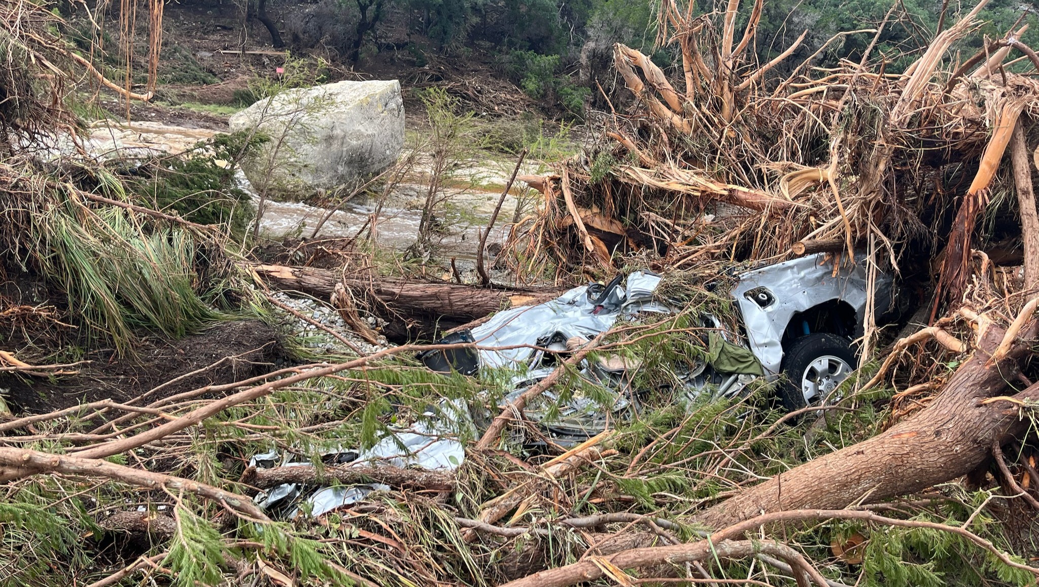 • Removing massive debris lodged in the river, including three vehicles buried upstream from the house
