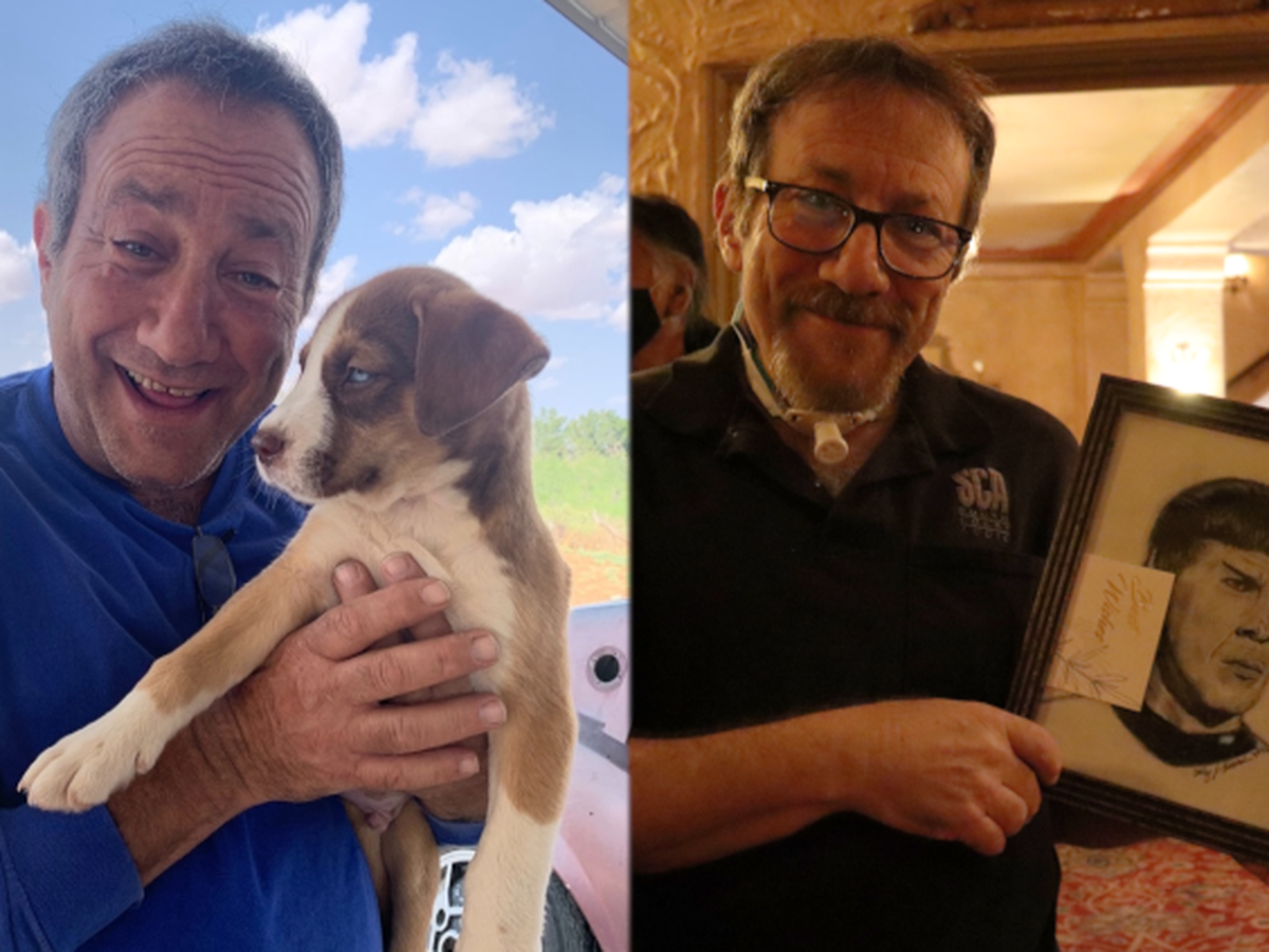 In 2022, Russ was diagnosed with stage 4 laryngeal cancer. Before he could begin treatment, most of his teeth had to be removed. He had to get a tracheostomy. Chemo took a toll on him. The radiation treatment left permanent damage to his neck and jaw, but thankfully, put his cancer in remission! For a while all his nutrition came from a tube directly to his stomach. Now that he's recovered some more, with a lot of concentration, he is able to drink and eat. But there's two things he can't really do anymore--chew and smile.