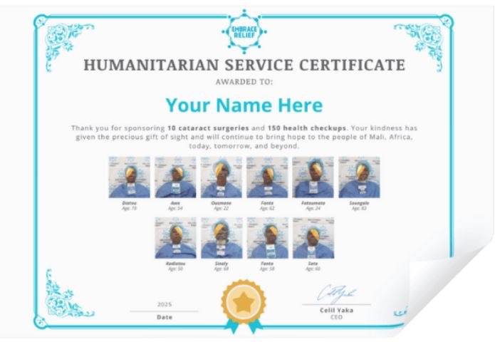 “Cataracts are the leading cause of blindness globally, yet a simple surgery can restore someone’s sight, someone’s future. Imagine losing your sight to something completely treatable and not having the means to fix it. That’s the reality for millions of people around the world living with cataracts. Thanks to the incredible support of people like you, Embrace Relief’s Cure Cataract program — which includes our medical centers in Mali, mobile health clinics, and medical camps, as well as our efforts in conjunction with global partner organizations — have helped more than 40,000 people regain their vision. That’s 40,000 mothers, fathers, children, and grandparents who can now see their loved ones again, return to work, and live a normal life.”