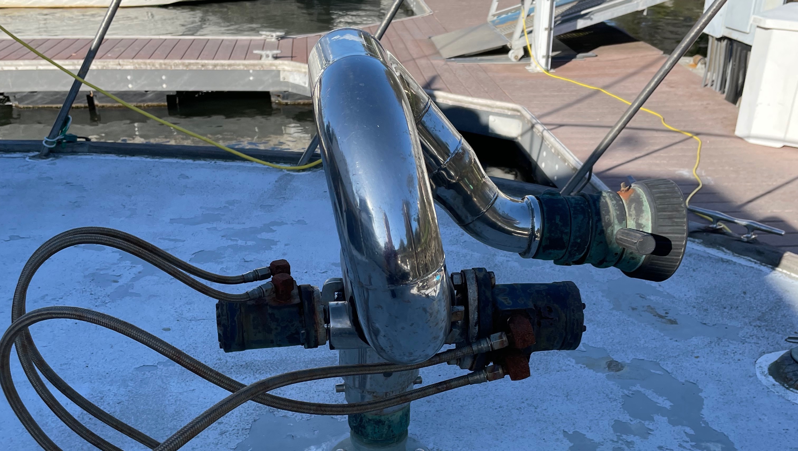We plan to donate the old fire monitor (aka water cannon) back to the fire department or other museum/collection and refit the lazaret (compartment for the water pump) for an air compressor.