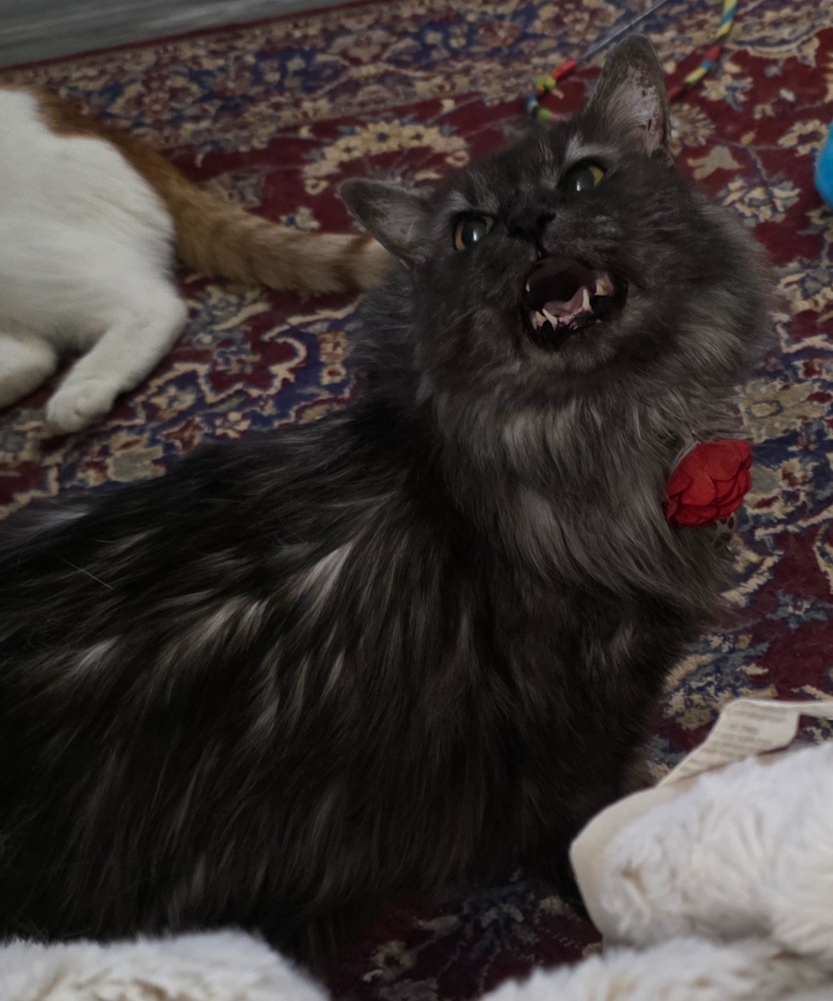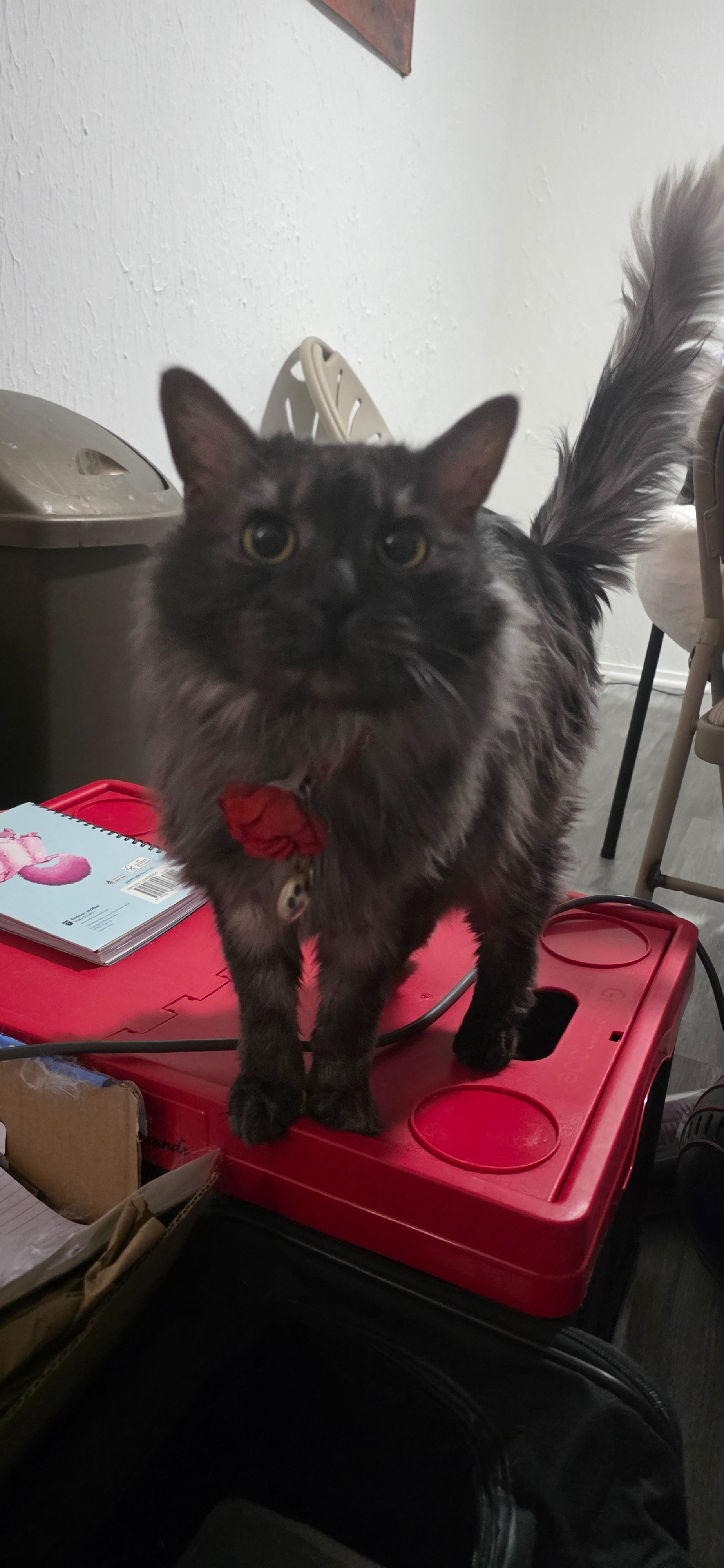 Ari has severe separation anxiety that causes a flare of inflammatory bowel like symtoms (severe and profuse vomiting to the point of blood) and she refuses to eat in a hospital or boarding kennel environment. Because of this, my sister made the impossible but necessary choice for me to take in her cat until her family was stationed somewhere they could safely reunite with Ari.