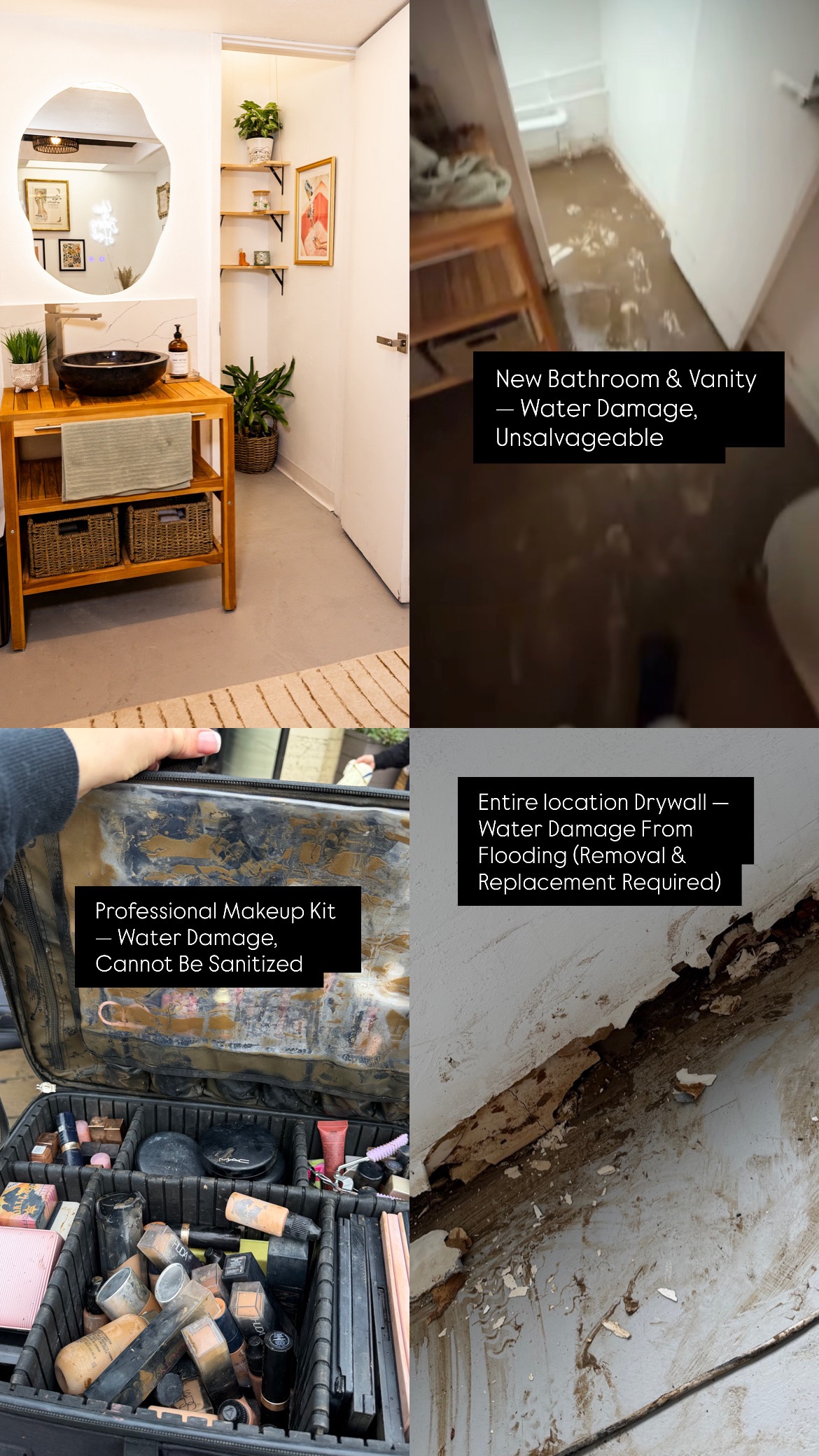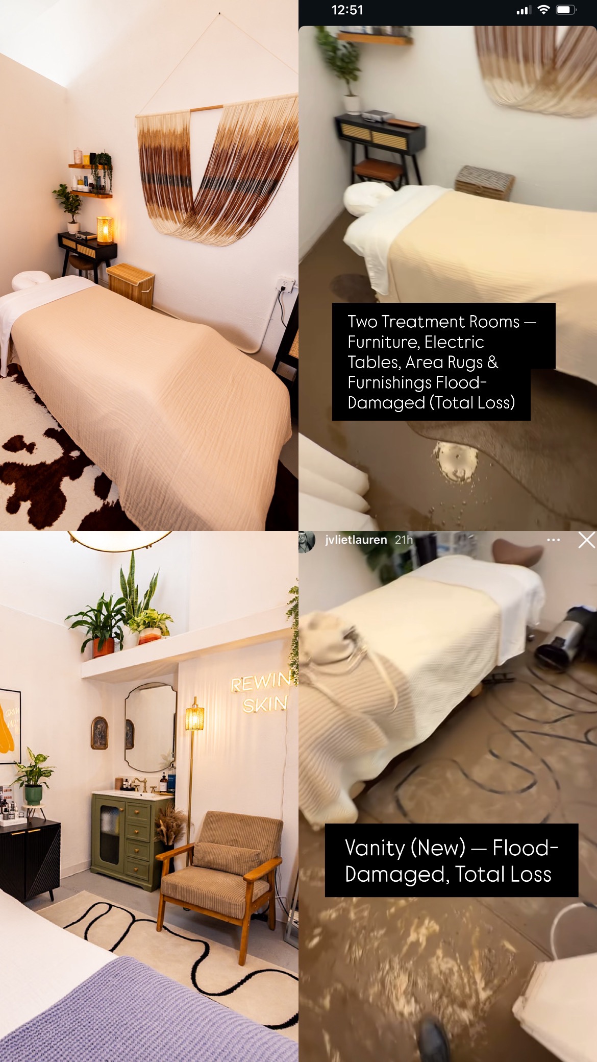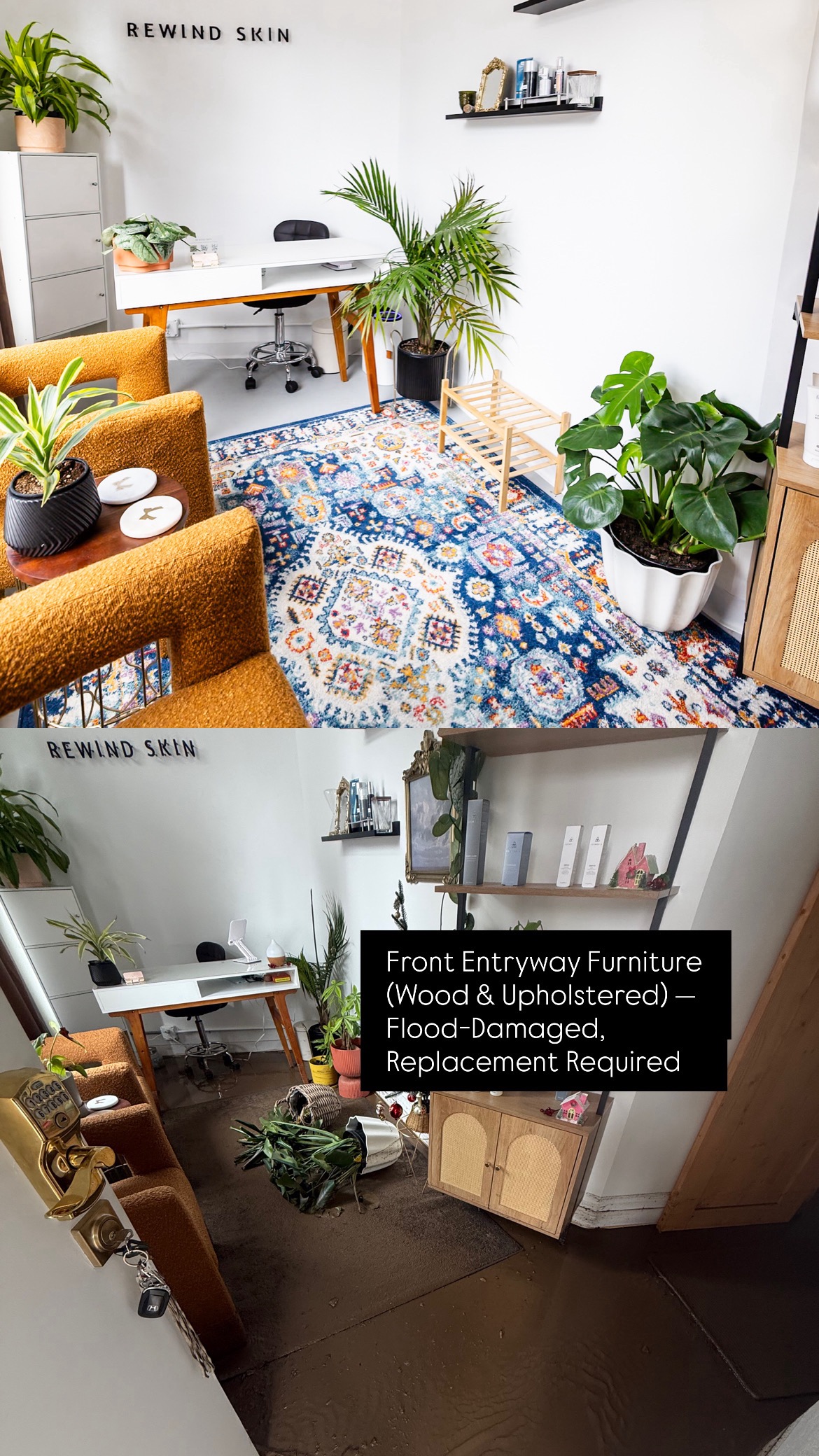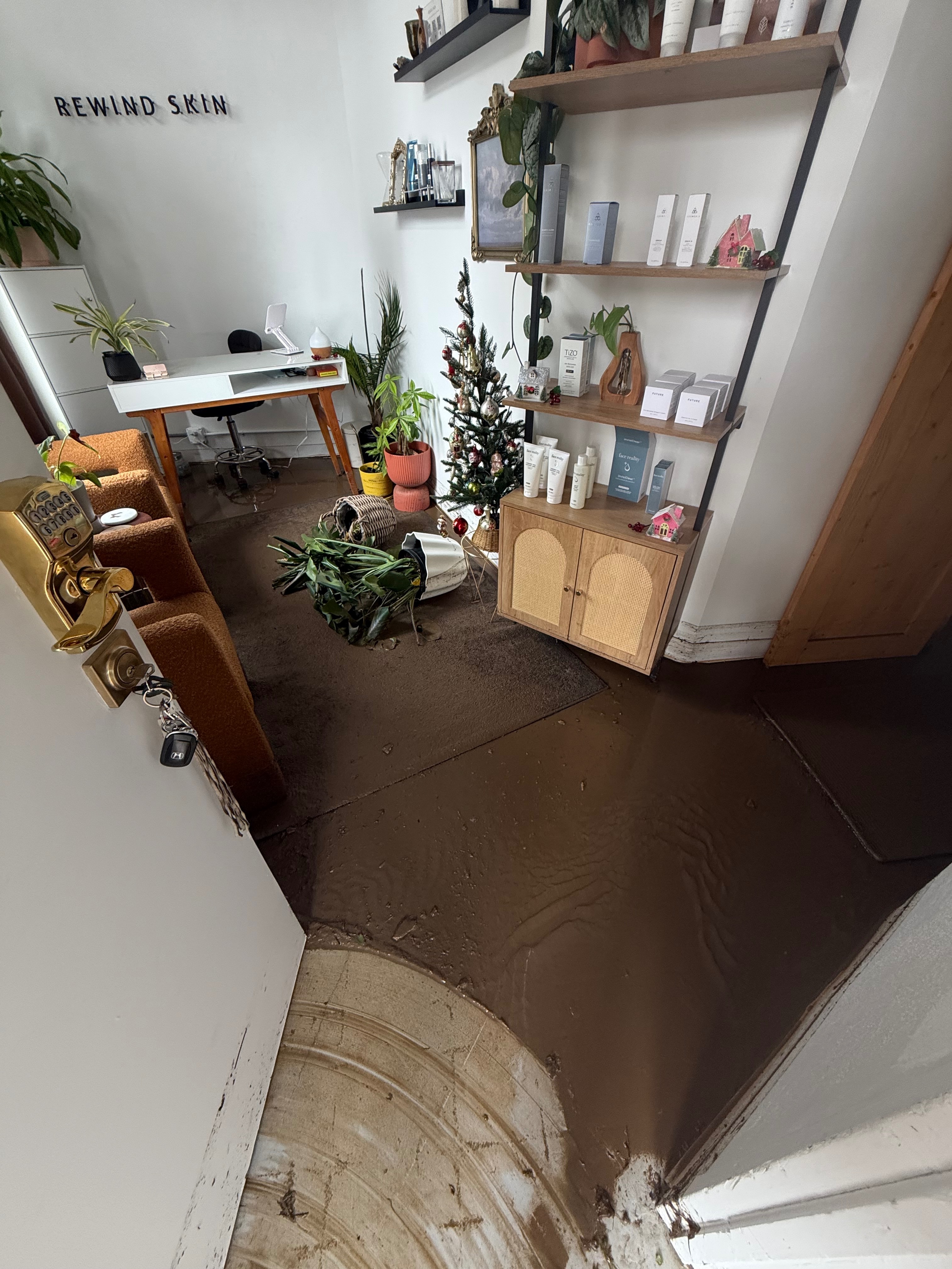 An unexpected flood caused extensive damage throughout the space—impacting treatment rooms, furniture, equipment, electrical tables, rugs, drywall, the newly renovated bathroom and vanity, storage areas, and inventory. Unfortunately, insurance does not cover the damages, leaving Juliet responsible for restoration, replacements, and lost operating time. As a small business owner, this setback is devastating—especially after just opening her first storefront.