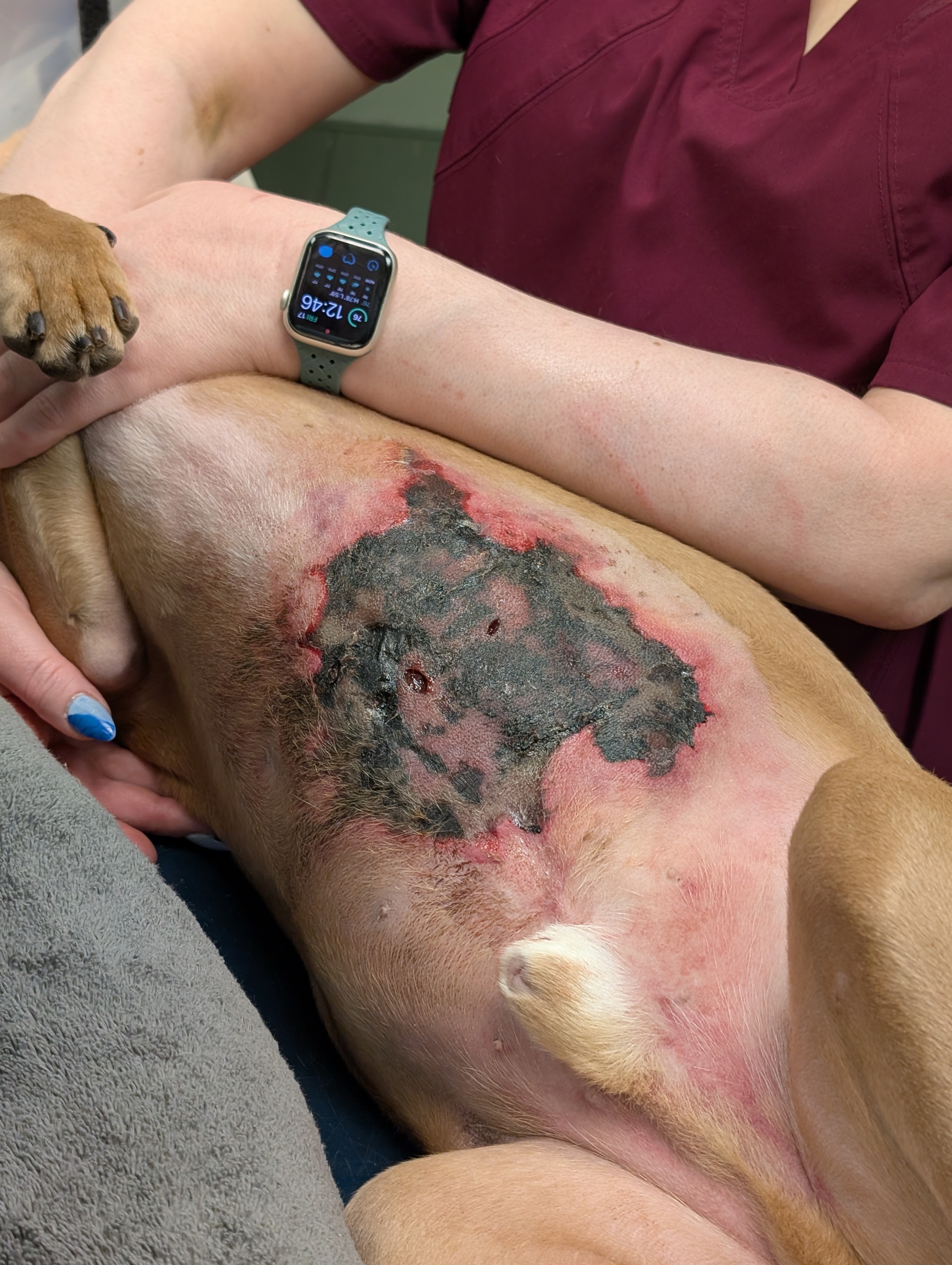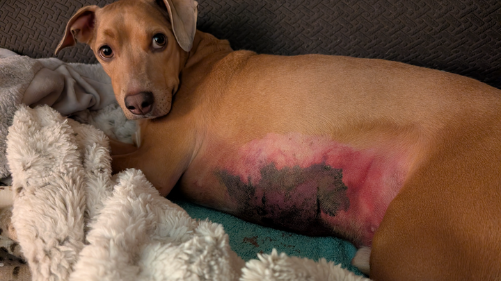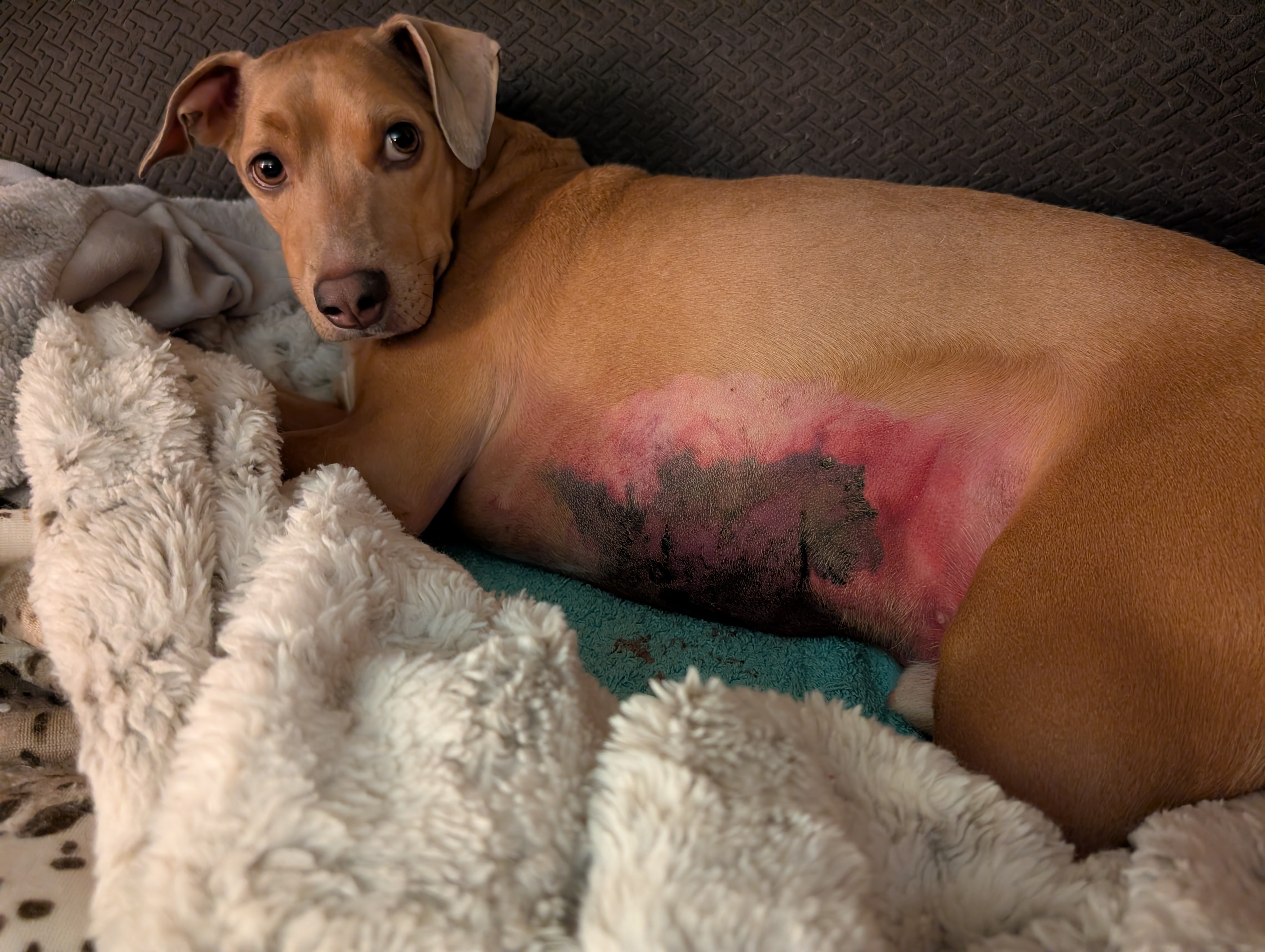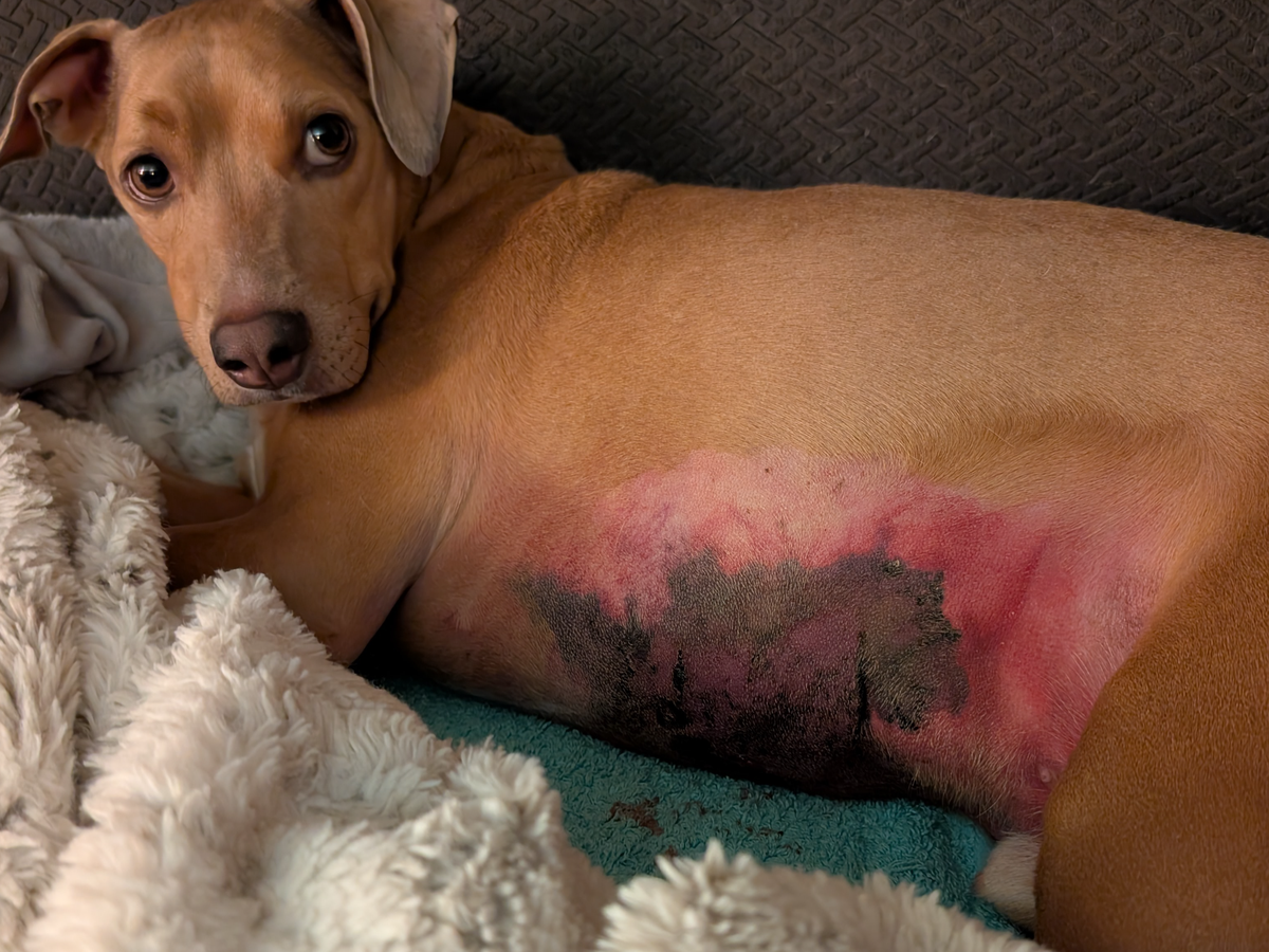 Unfortunately, things took a turn for the worse. By Friday, Rex's condition had become critical. He was diagnosed with cat bite necrotizing fasciitis, a life-threatening infection, also known as "flesh-eating disease". That evening I rushed him to the emergency vet hospital. To save his life, the surgeon had to remove most of the skin on his chest and abdomen to stop the infection from spreading. Now, Rex faces a long and expensive road to recovery over the next four months.