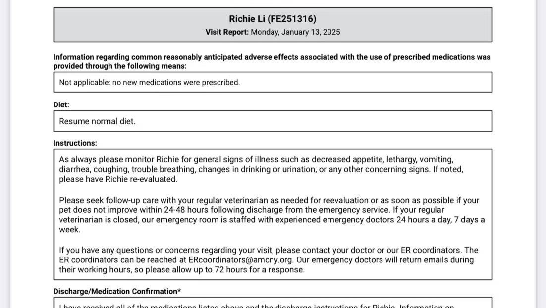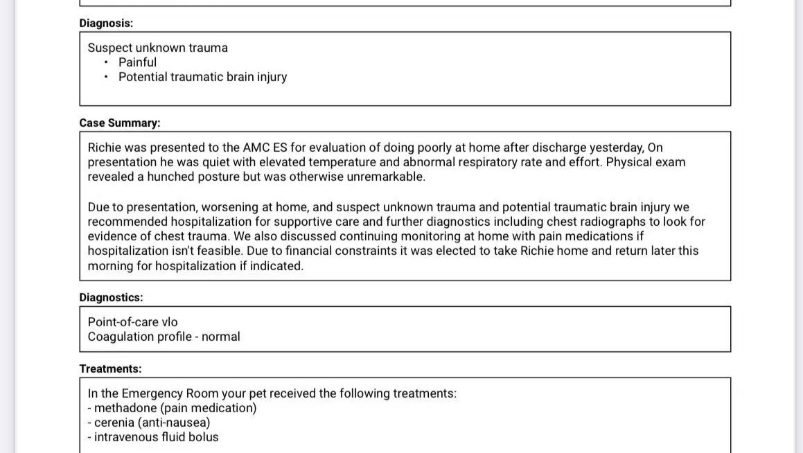 Richie is now being admitted to The Schwarzman Animal Medical Center ER Department waiting for further treatment.