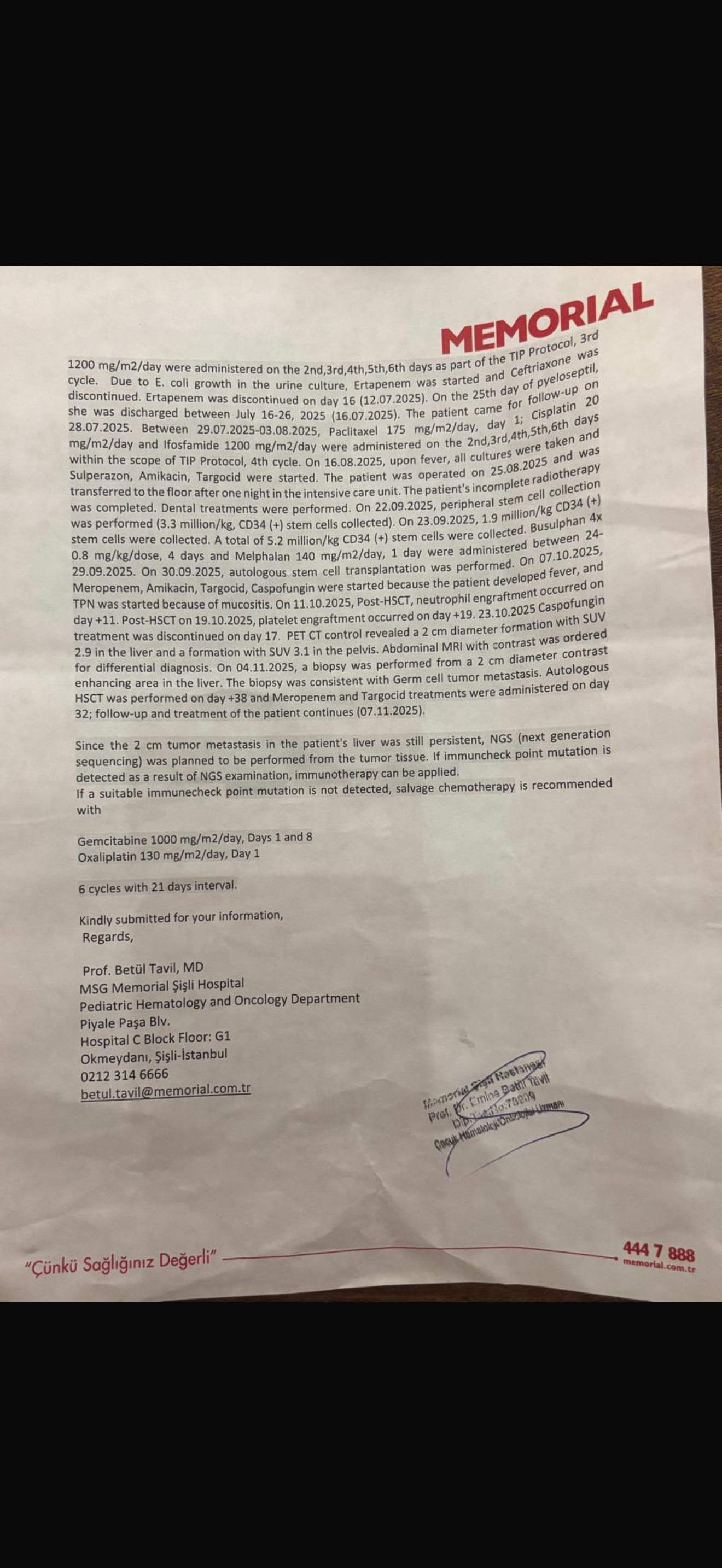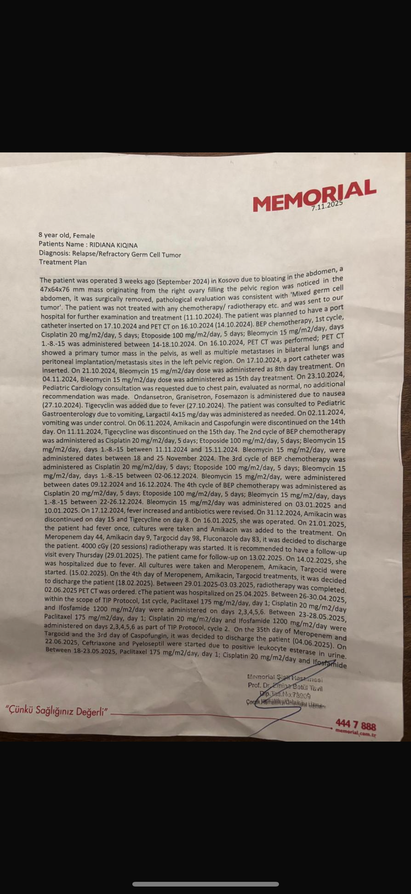 Pavarësisht dy trajtimeve të mëparshme dhe shpresave tona të pafundme, analiza e fundit tregoi se sëmundja është rikthyer me rrezik të madh. Mjekët në Stamboll kërkojnë trajtim urgjent, por spitali nuk e ka pranuar ende për shkak të mungesës së pagesës së plotë prej 85.500 euro. Pa këtë shumë, trajtimi nuk mund të fillojë.
