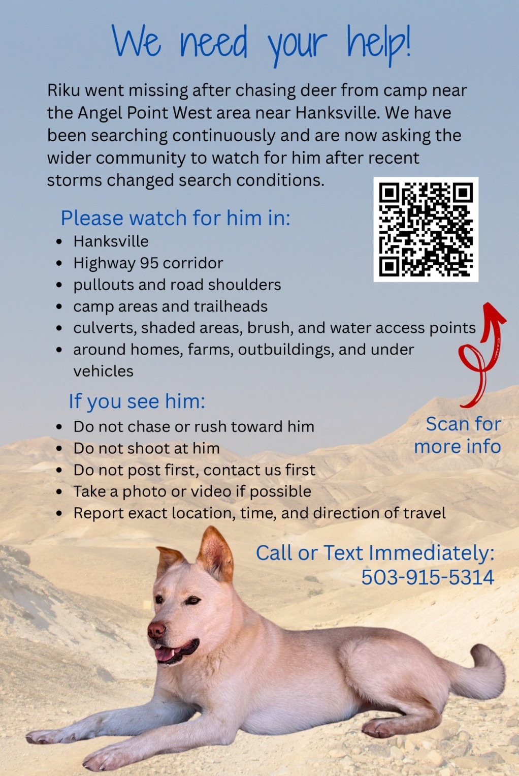 LAST SEEN: 4/3 6:30pm at the end of BLM rd 0104 chasing deer east in the direction of Angel Point. Tracks found at water sources, cameras placed but no sightings. ‼️MICROCHIPPED‼️NO COLLAR‼️