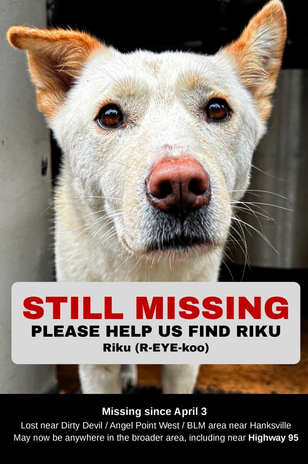 This fundraiser is for my cousin, Riley. One of her beloved pups, Riku, went missing on April 3, 2026, from their campsite in the desert of Southern Utah after chasing off some deer. His brother came back, but he didn't.