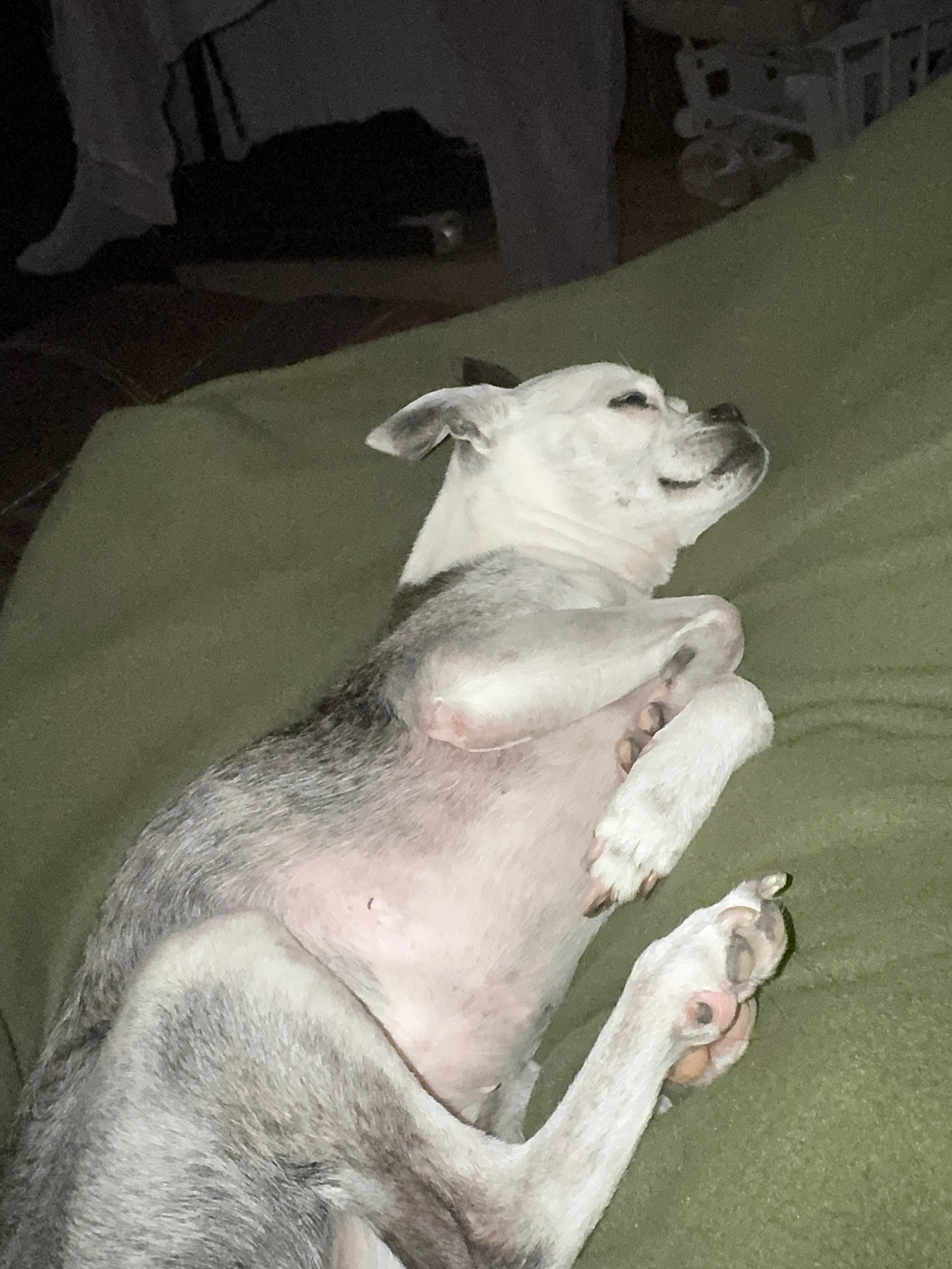 About four months ago, Roxy started having trouble—she wasn’t eating, seemed very tired and lethargic, and just wasn’t her normal self. At the time, I couldn’t afford to get her an x-ray, so we hoped it was just a bout of bad anemia. Unfortunately, on 3/8, things took a turn for the worse. Out of the blue, she stopped eating again, was sleeping all day, and could barely stand. We rushed her to the emergency vet, where they discovered a tumor on her spleen. Right now, she’s very out of it, and it’s heartbreaking to see her like this.