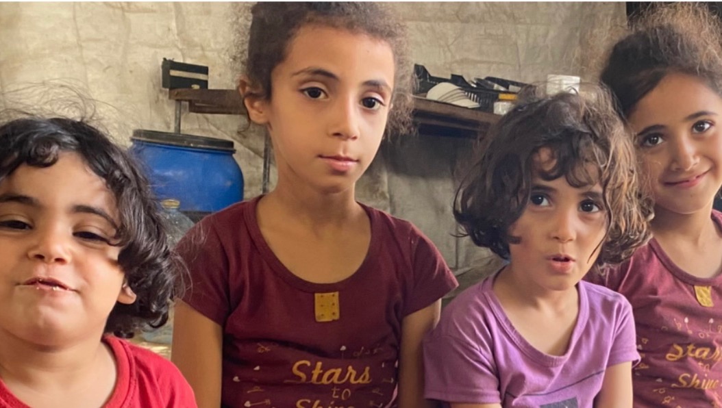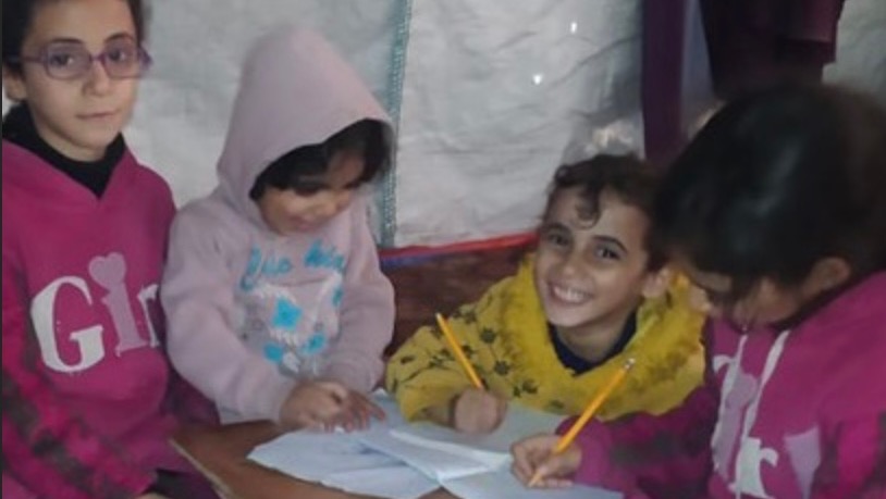 This is from left to right, Raghad (3), Toulin(8), Nidaa(5) and Rital(9). The girls used to enjoy school and nursery but all that has been taken away, but, being very brave little girls they have tried to continue to study inside their tents. In Adam’s words: