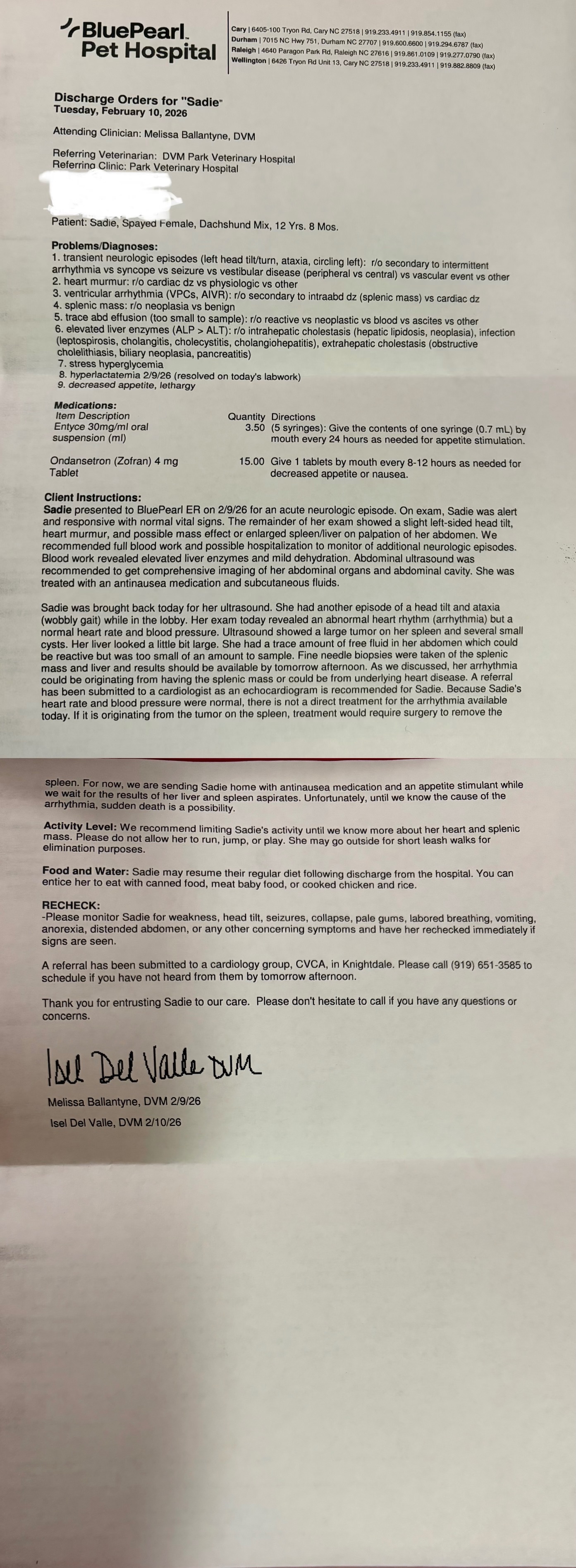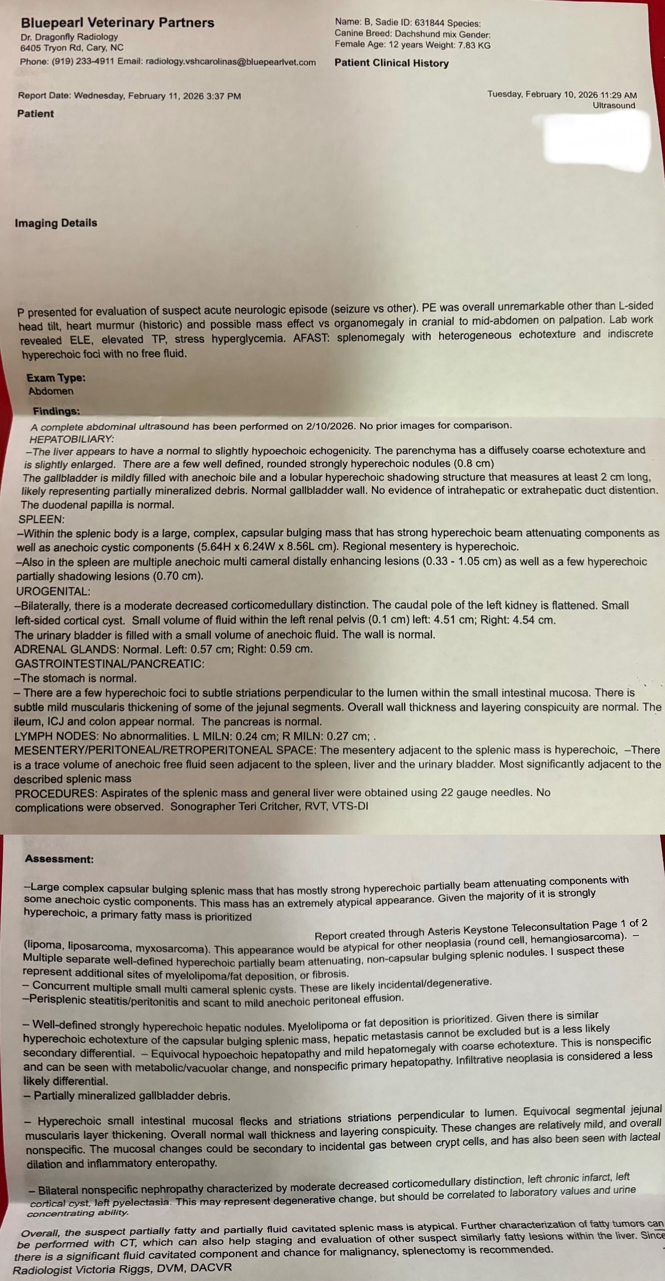 On Monday, 2/9/26, Sadie suddenly collapsed at home. It looked like a seizure, and I rushed her to the emergency vet. After a long night and a series of tests and administered medications, followed by more tests the following day-bloodwork, panels, X-rays, and 2 different types of ultrasounds—the vets discovered she has a heart arrhythmia and a large tumor on her spleen. Her liver is also slightly enlarged and showing elevated enzymes. On Friday 2/13, she got an echocardiogram to further explore why she collapsed, look into why she has an arrhythmia, and see if she would be able to handle surgery. She was cleared for her splenectomy and after surgery, her spleen/tumor and liver will be biopsied to find out more and go from there and possibly need treatment.