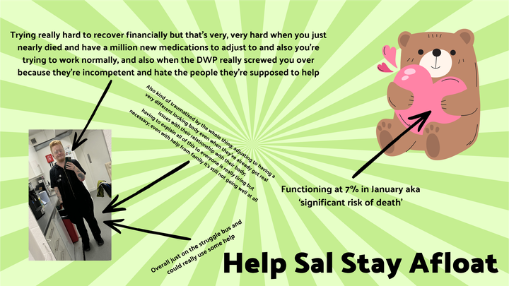 I was diagnosed with dilated cardiomyopathy in late January, which had caused my heart to fail almost 100%. Obviously, I couldn’t work while I was recovering and I was on Statutory Sick Pay, so even with help from my family I’ve ended up with some credit card debt from paying rent/bills and for basic amenities (and also new clothes, as all of my clothes were 2+ sizes too big after losing around 9kg of fluid that had accumulated due to my heart failing). Predictably the DWP were useless, and declared me unemployed because they didn’t register any of my earnings for February - resulting in them overpaying me for February into March and then leaving me with no money or support for March into April. So that’s another very frustrating hit to my very precarious finances.