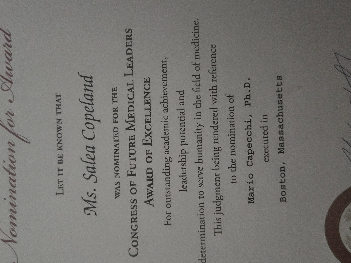 Hello I'm Salea Copeland I'm 15 years old (as I am writing this) and I was nominated for the congress a future medical leaders and received an award of excellence because of my good academics, GPA, and humanitarian work and what I have contributed in my community, (e.g, feeding the homless, volunteering at hospitals, and helping others.) Now I have an opportunity to go Boston Massachusetts in June of 2026 but to be able to attend, I have to pay a tuition of 1,285 for the tuition by october 22 2025, this is a really big deal for me and I couldn't be more grateful, to have this big opportunity at my age, but to pursue this I need some help, I promise its worth it because with this, my dreams of becoming a physician aren't just dreams anymore. Its destiny. So if your able to donate a small amounts towards the tuition it would be highly appreciated.. Thanks in advance for making a donation toward my future...