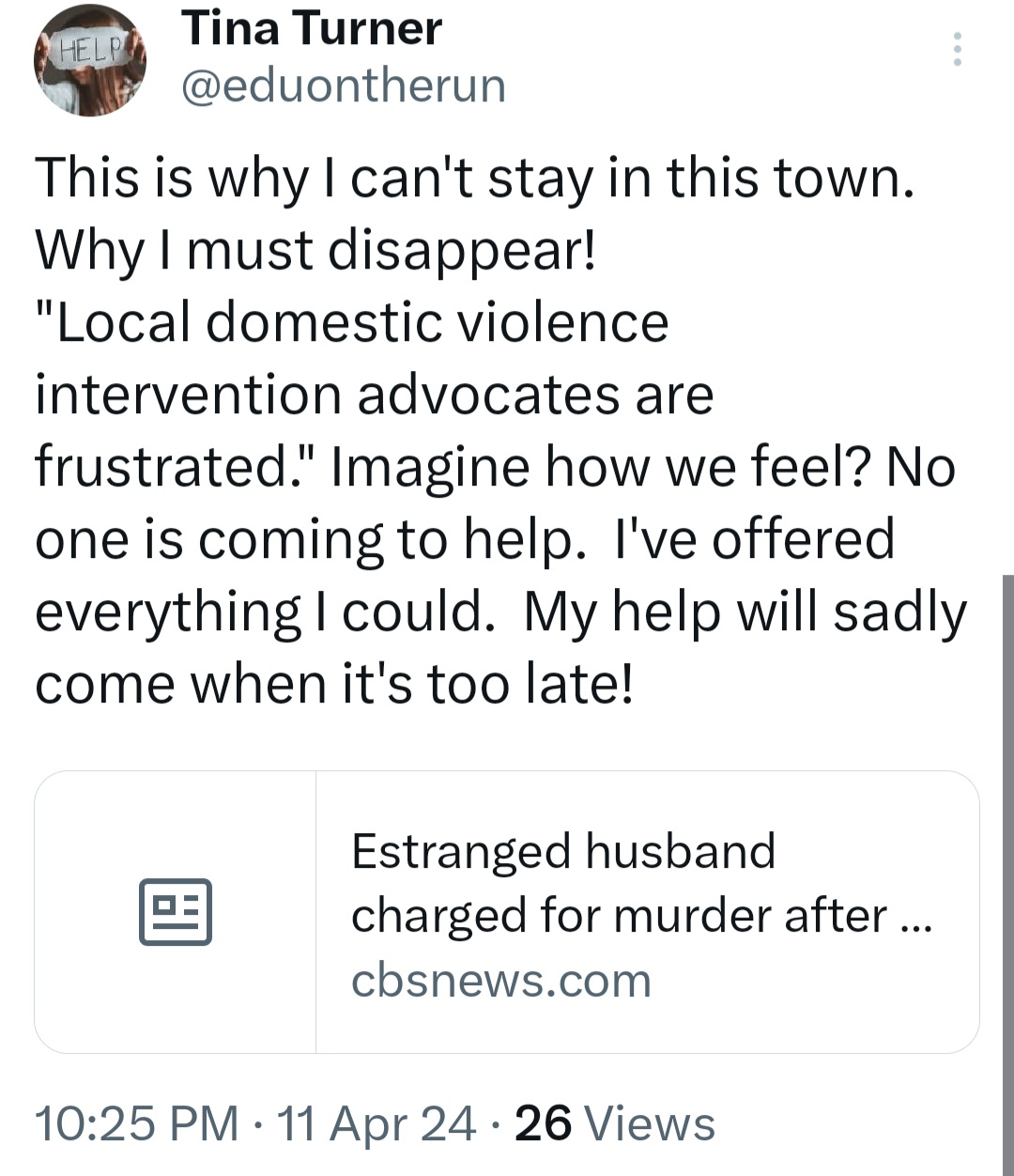 Domestic violence situations are escalating nationally. My greatest fear is that without help, Sally could become another story we read about after it’s too late. I cannot stand by and let that happen if there is something I can do.