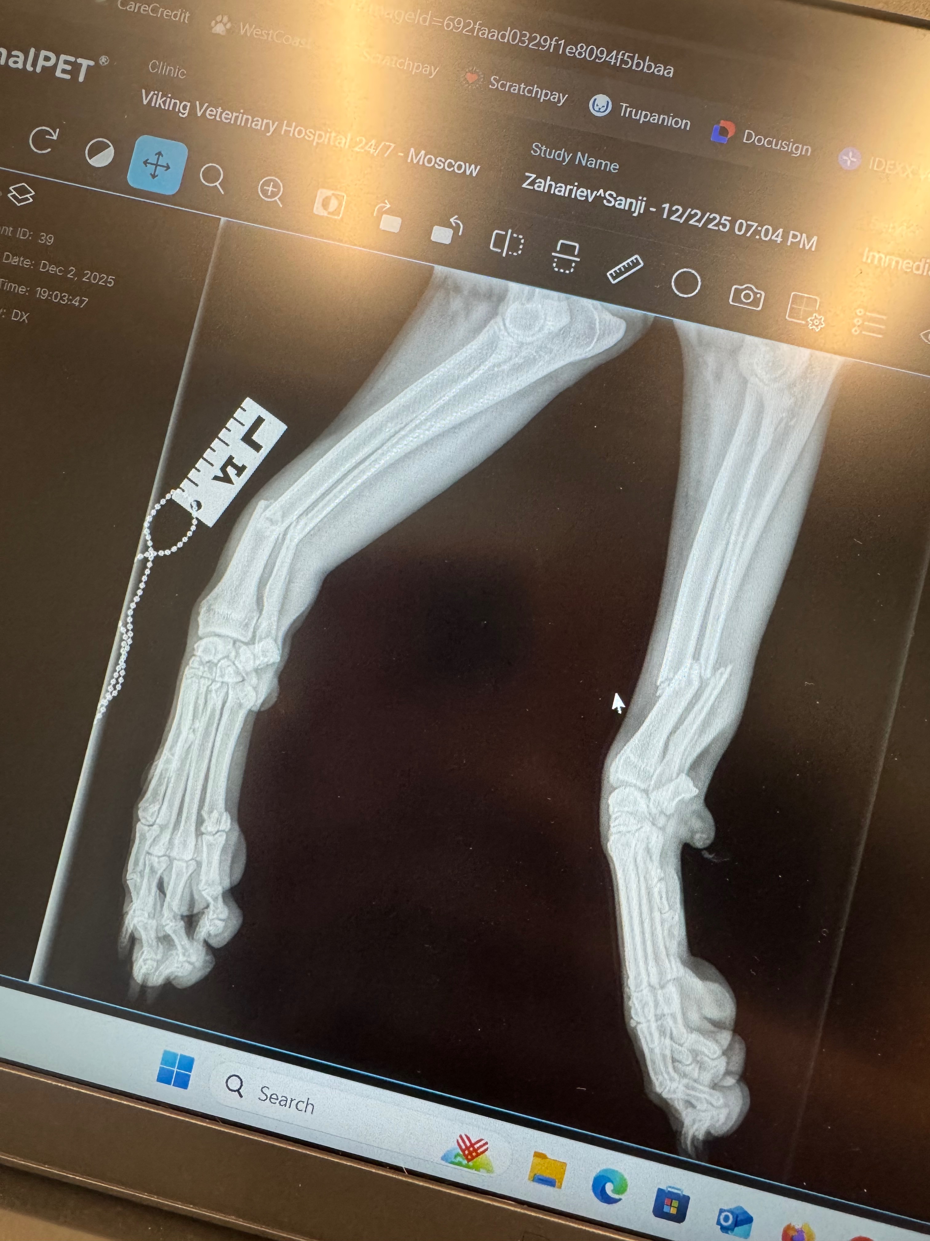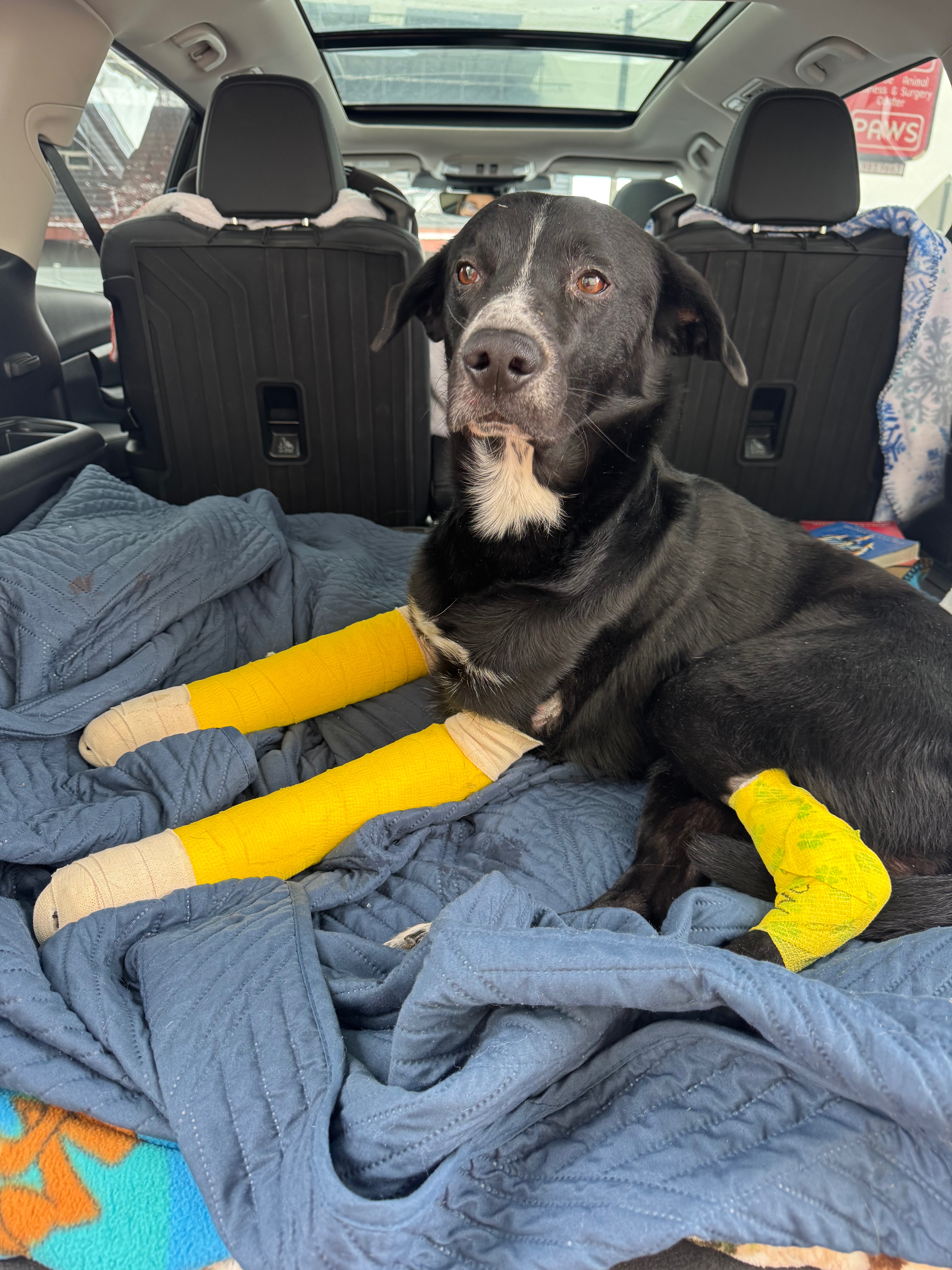 Sanji has been a beloved part of our family since he was a puppy, and now at six years old, he means the world to us and our three young children. On Tuesday evening of December 2nd, Sanji was hit by a bus. The accident left him with staples in his head and shoulder, and both of his front legs were broken—two complete breaks in his left leg and three in his right. The road to recovery will be long and challenging, as Sanji will need surgery involving plates and pins to repair his legs, followed by extensive after care. He had his surgery at PAWS in Moscow and that bill was $7500 along with weekly splint changes for $110 for 8 weeks. The Viking pet hospital bill was $1952…