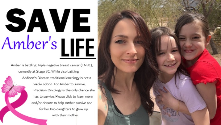 Amber has been diagnosed with Triple-negative breast cancer that is currently at Stage 3C. Combined with her coexisting Addison's Disease, she is not a candidate for immunotherapy, as such treatment could cause life threatening symptoms. In addition, and because of the type of cancer as well as the stage she is at, the extreme treatment offered by traditional oncology would likely take her life as well. As you can understand, traditional oncology, or oncology that is covered by health insurance companies, does not facilitate a viable treatment option for Amber.