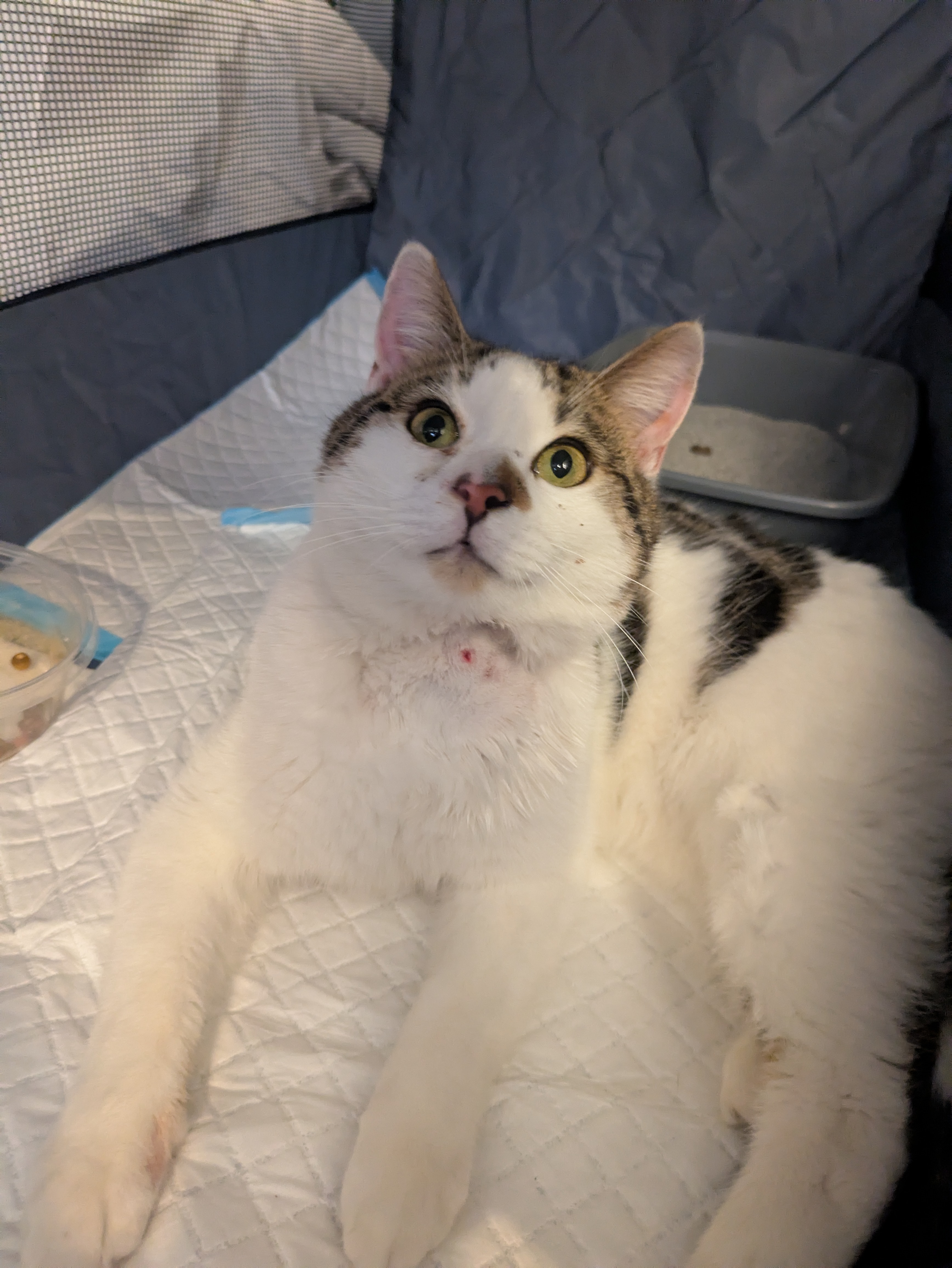 This is Calvin. One of our neighbors shot him. Calvin is one of the neighborhood strays in our community, and we've fed and cared for him since he was a kitten. Since he grew up around us, he's very social and super friendly—honestly, I've never met a cat this sweet. On Friday, we found him crawling up to our door, stumbling and dragging his front leg, with a bloody wound on his neck. We assumed he'd broken his leg and thought he'd been attacked by something or possibly hit by a car. But after taking him to the vet, we learned that what he went through was much, much worse. The vet took an X-ray, which showed a bullet lodged in his spine. The bullet barely missed his artery and is only a hair away from his spinal cord. They believe that it's damaged a nerve that has affected his ability to move and feel his leg. His prognosis is uncertain, as surgery to remove the bullet would cost thousands of dollars, which we don't have. Now, all we can do is wait and see what happens. If the bullet migrates, he could become completely paralyzed and would have to be euthanized. We've already spent a lot in vet bills, and as much as we'd love to get him surgery to remove the bullet, we simply can't afford it. We're trying to raise money to give him the best chance of survival. If he doesn't make it, we will use any funds raised to TNR the remaining community cats. We love Calvin and want to give him the best chance at life. Any support, no matter how small, will make a difference for him and our community cats. Please help us save Calvin and support our neighborhood strays.