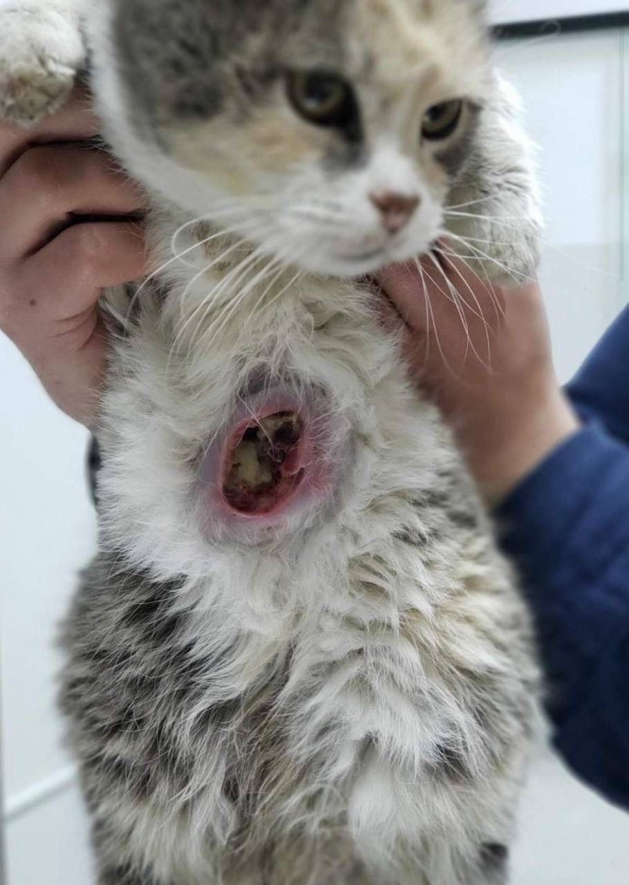 Just a few days ago, we noticed something was wrong. Nala became withdrawn, stopped eating, and her mood changed. When we looked closer, we found a terrible wound on her stomach. We rushed her to the vet, terrified of what they might say. After tests and examinations, the diagnosis hit us like a storm — a mammary gland tumor. The doctor explained that this kind of tumor appears in 80–90% of cats over 8–10 years old, and that urgent surgery is the only way to save her.