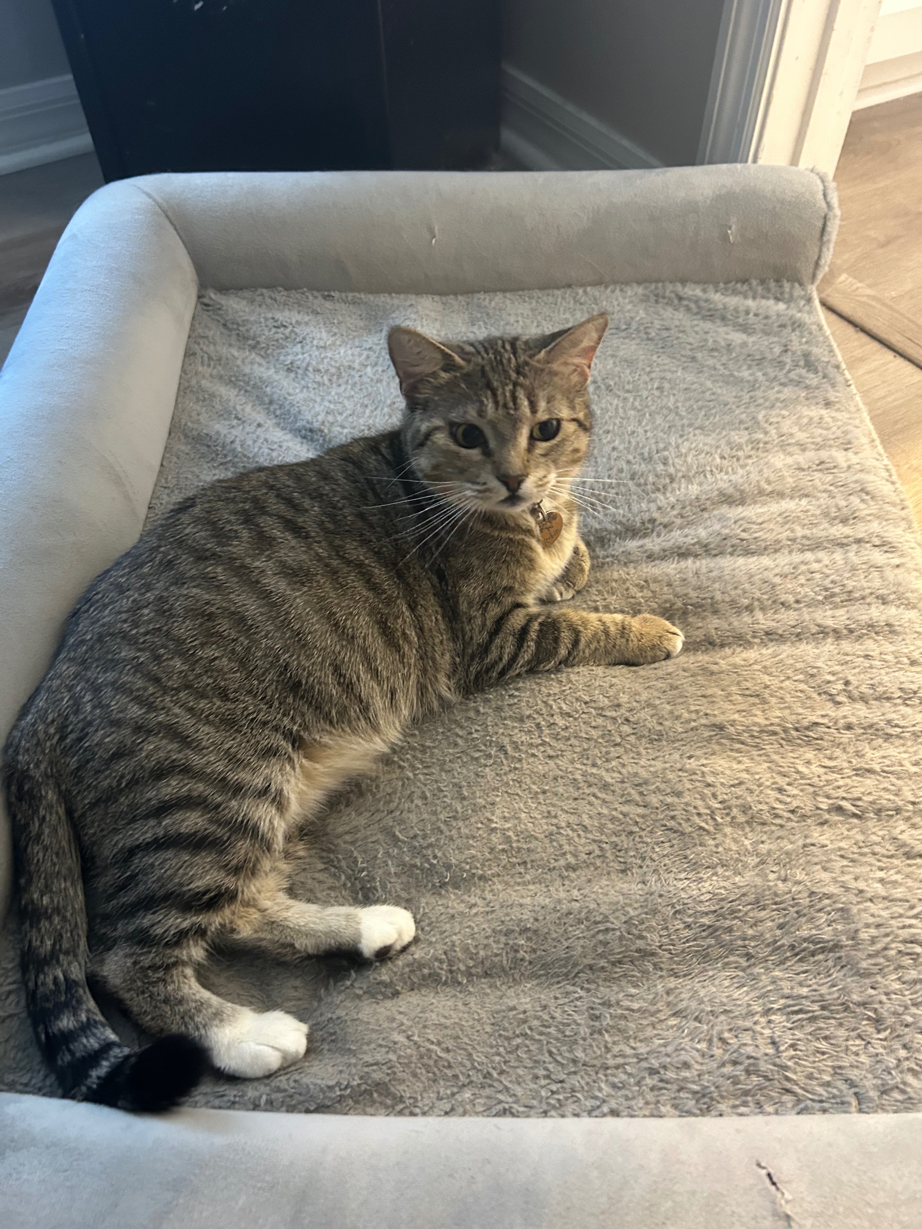 Now she’s only 2 years old and fighting for her life. She’s been peeing blood for a while, likely due to bladder stones or a painful infection. Just recently, she developed an eye infection too. She’s still so affectionate and tries to play with my other cats, but we can tell she’s hurting.
