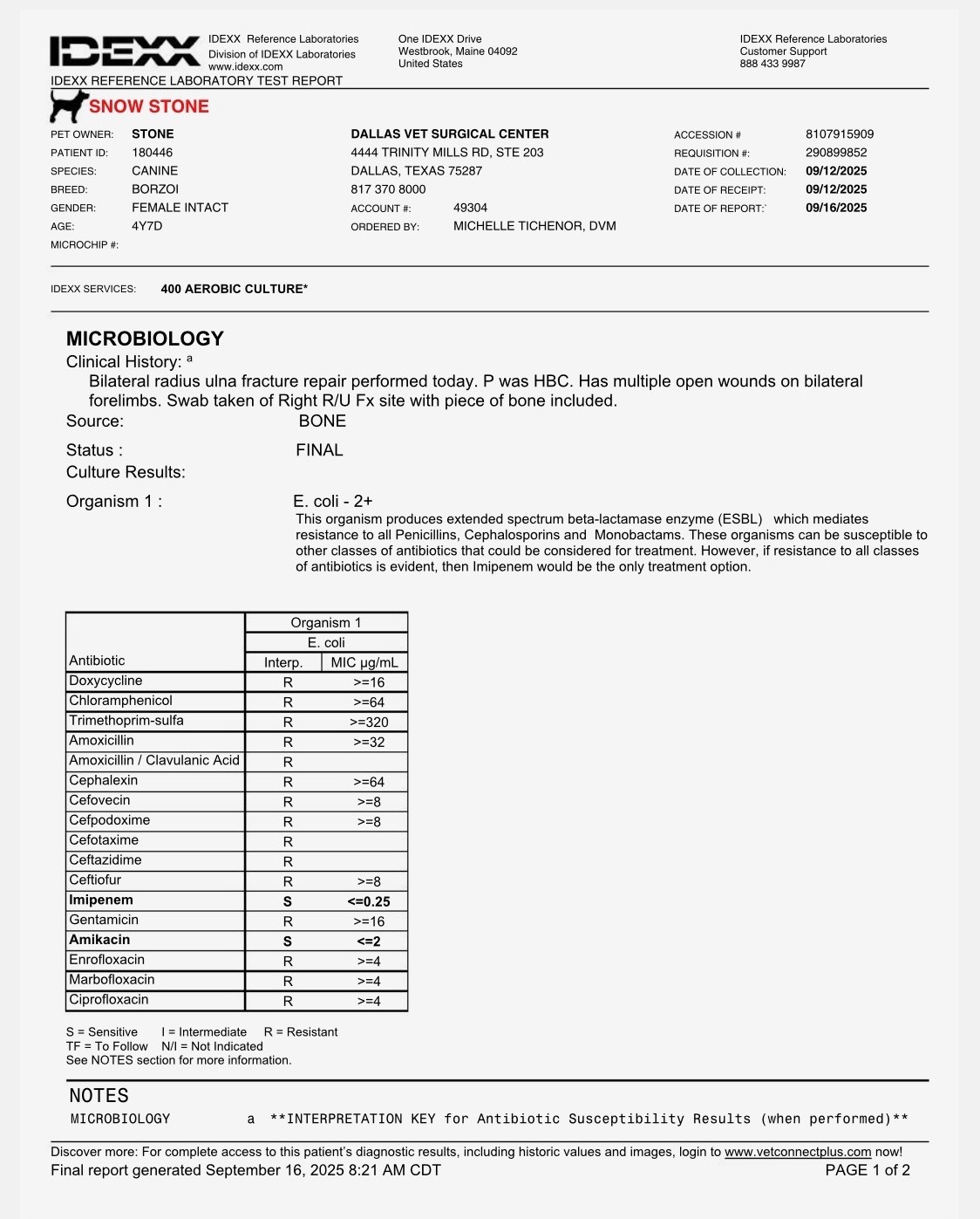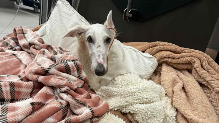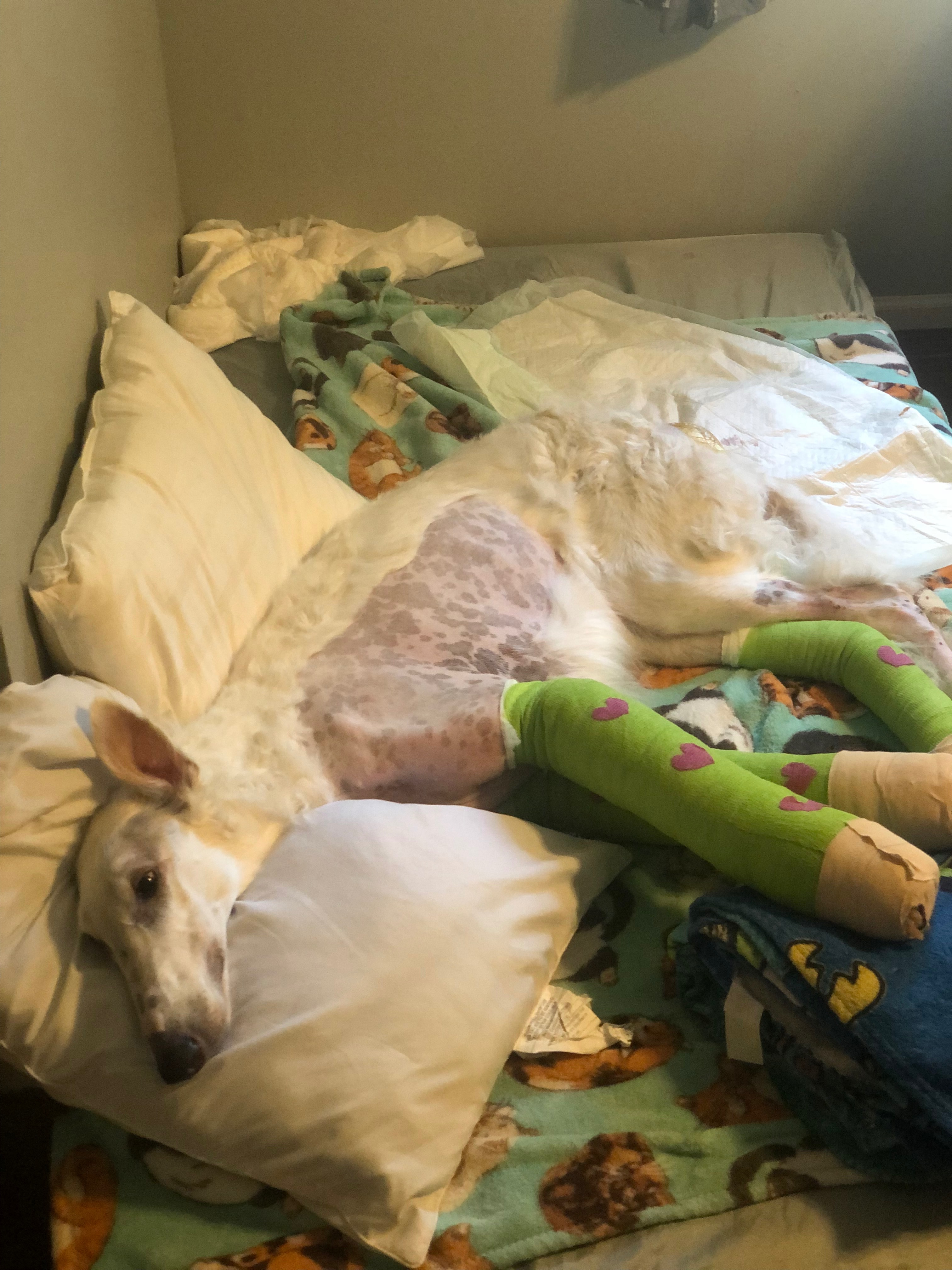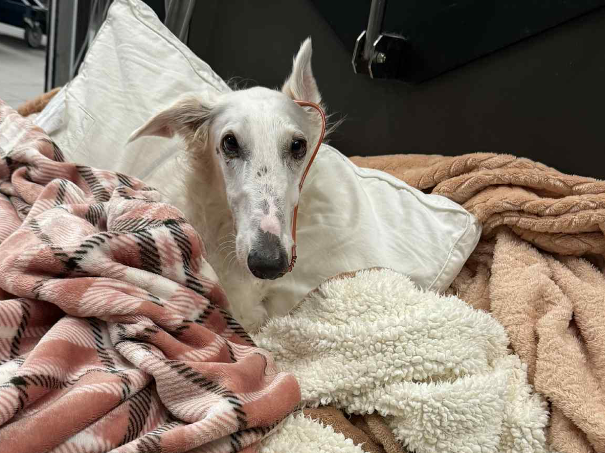 On 9/9/2025, sweet Snow the Borzoi leapt over her backyard fence and was hit by a car. She was rushed to an emergency clinic in Fort Worth, where she was diagnosed with a pneumothorax, multiple lacerations all over her body, and bilateral radial/ulnar fractures. On 9/12/25, she underwent fracture repairs at an orthopedic surgery clinic and had plates put on both legs. She was given a good prognosis.