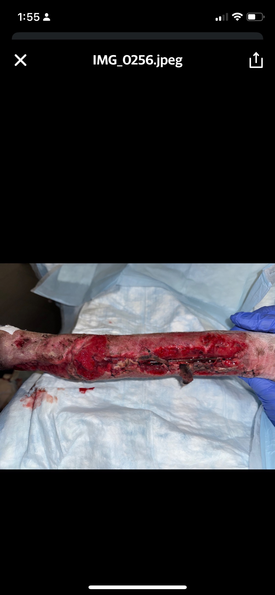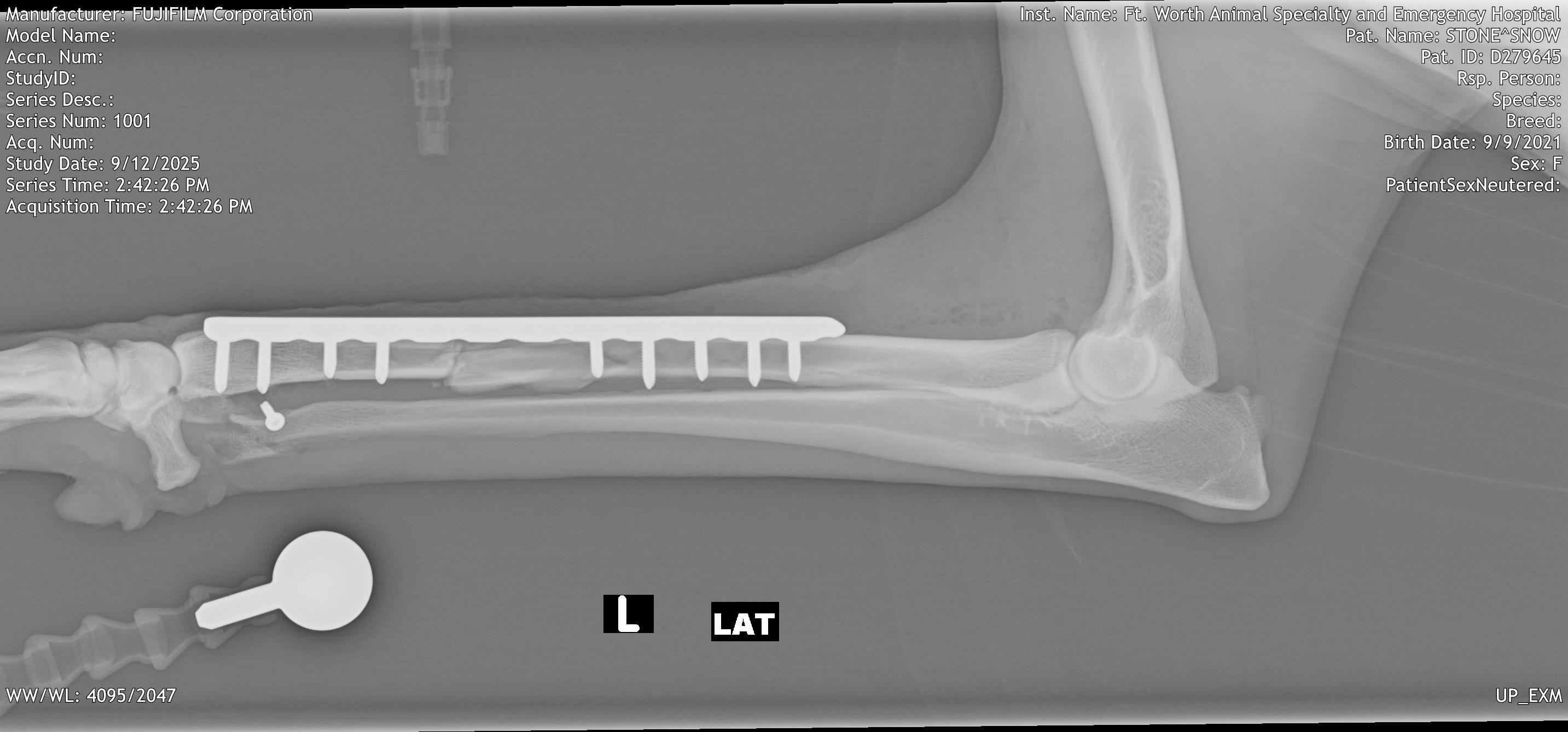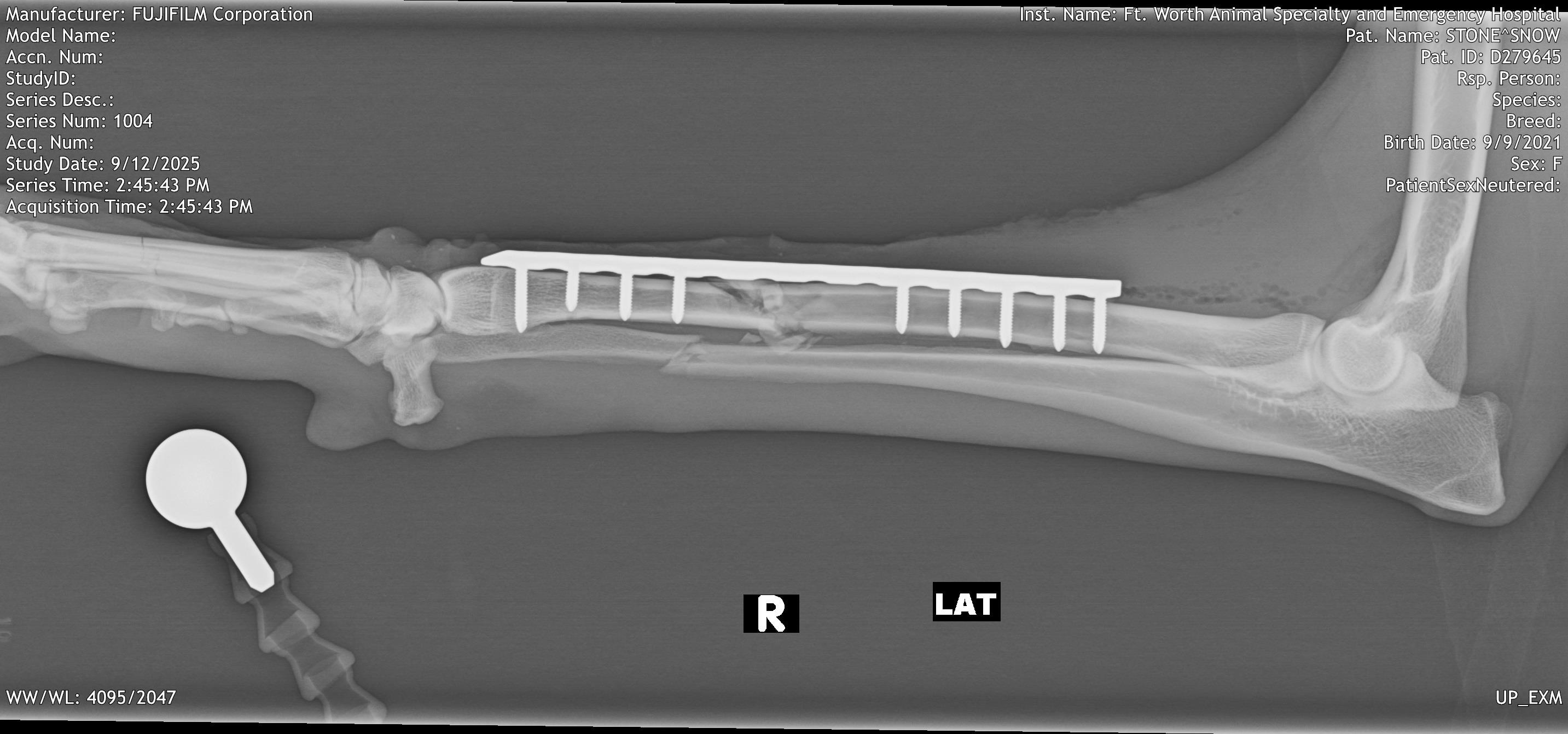 On 9/9/2025, sweet Snow the Borzoi leapt over her backyard fence and was hit by a car. She was rushed to an emergency clinic in Fort Worth, where she was diagnosed with a pneumothorax, multiple lacerations all over her body, and bilateral radial/ulnar fractures. On 9/12/25, she underwent fracture repairs at an orthopedic surgery clinic and had plates put on both legs. She was given a good prognosis.
