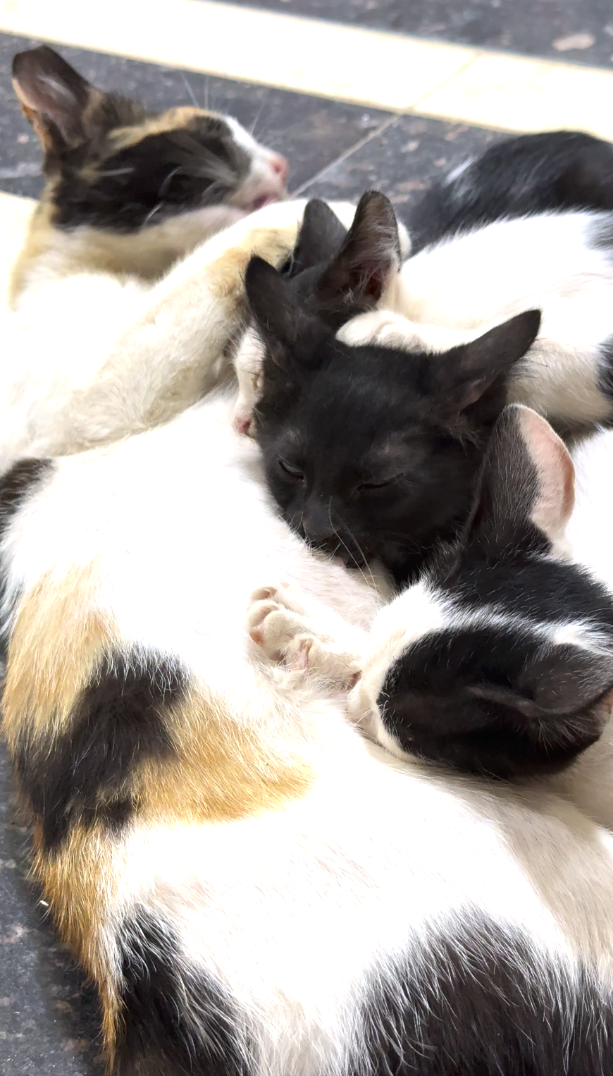 When I arrived in Dahab, Sophie started appearing at my door. Thin, frantic, and covered in dirt, she was clearly starving and desperate. At first, I thought she was just another stray looking for food. But she kept coming back, not just for the meals, but for help. Slowly, she led me to her hidden litter of four kittens, tucked away behind some cushions under a very loud gazebo next to a speaker.