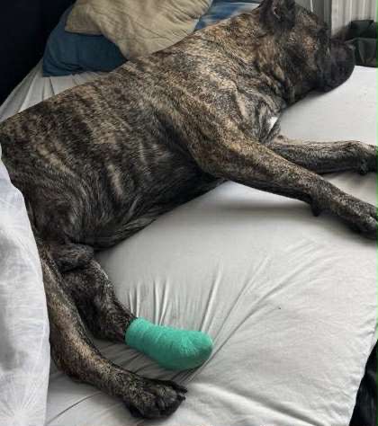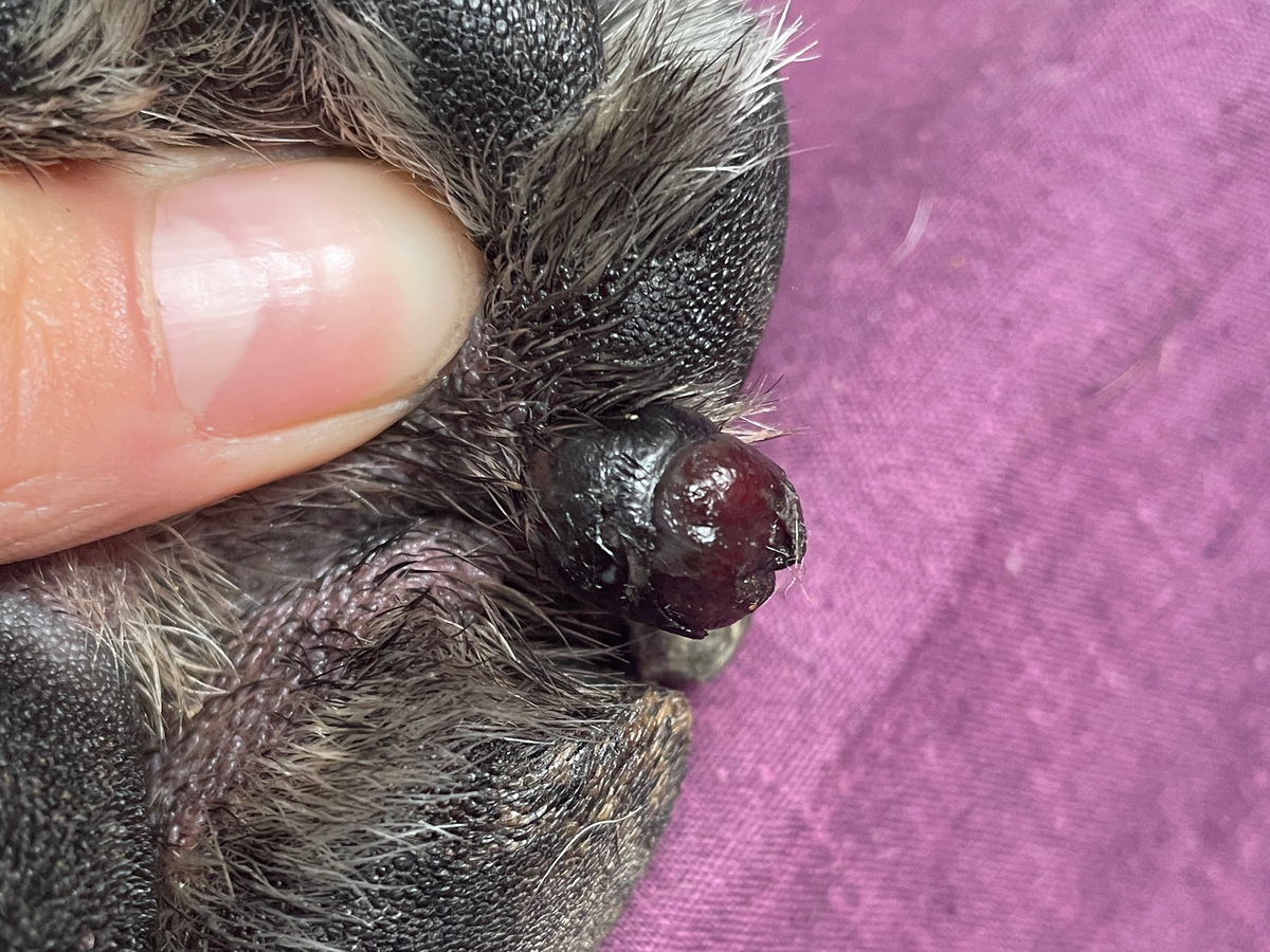 A recent emergency surgery was needed to remove a serious lump from a dog’s paw. The lump had burst open, causing bleeding and discharge, and there was a high risk of infection. The operation was performed as quickly as possible to prevent complications and relieve discomfort.