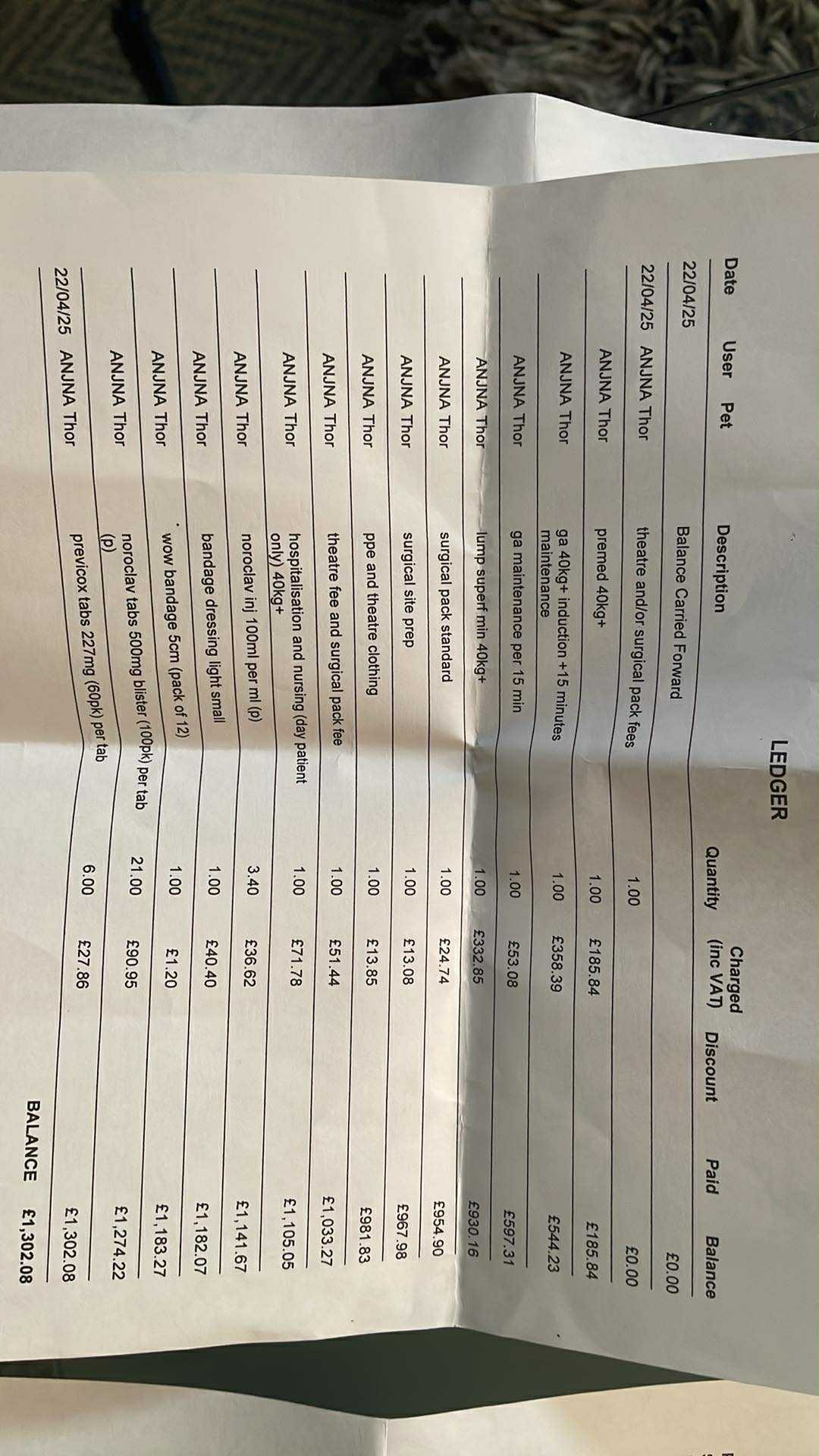 Although the surgery is now complete, there are still significant costs that need to be covered. The procedure itself cost £1,330, with an additional £110 spent on pre-operative medication. Post-surgery care involves further medications, antiseptics, wound treatment, and follow-up vet visits – bringing the total cost to around £1,700.