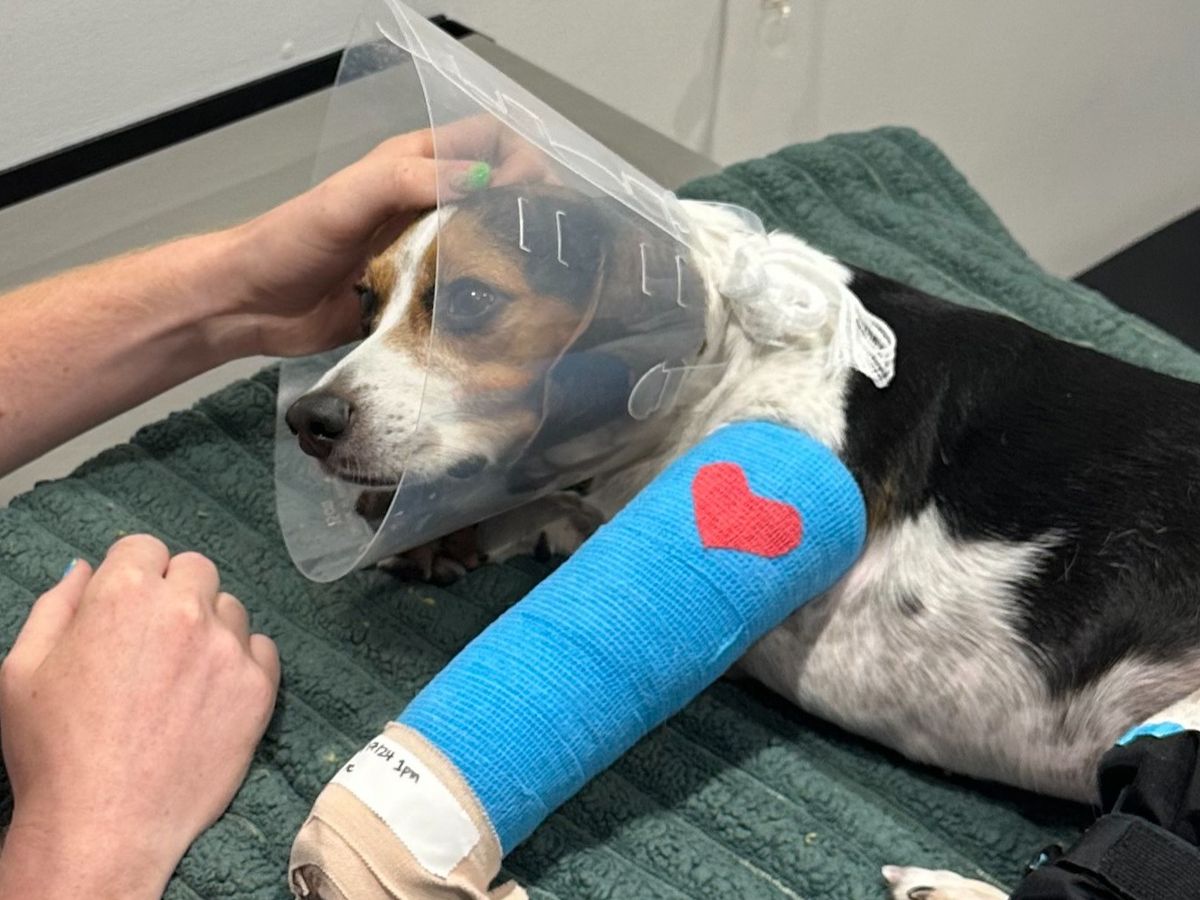 He suffered moderate injuries including multiple fractures to his front left leg. He is currently home and recovering from surgery, and will be in a cast healing for the next few weeks.