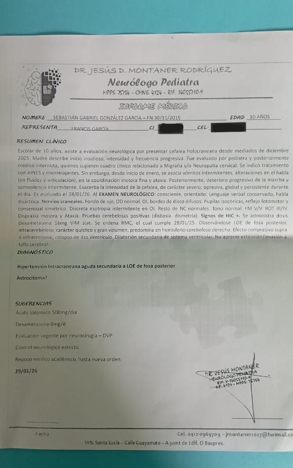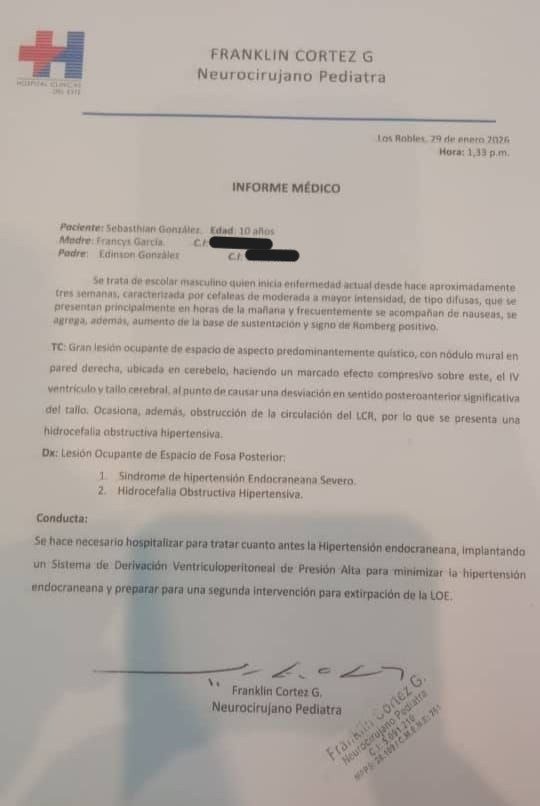 Según el informe médico, Sebasthian necesita hospitalización inmediata y la colocación de un sistema de derivación ventriculoperitoneal para aliviar la presión en su cerebro, seguido de una segunda intervención quirúrgica para tratar y extirpar la lesión. Sin un tratamiento oportuno, el riesgo de daño neurológico grave — e incluso de complicaciones que pongan en peligro su vida — es real.
