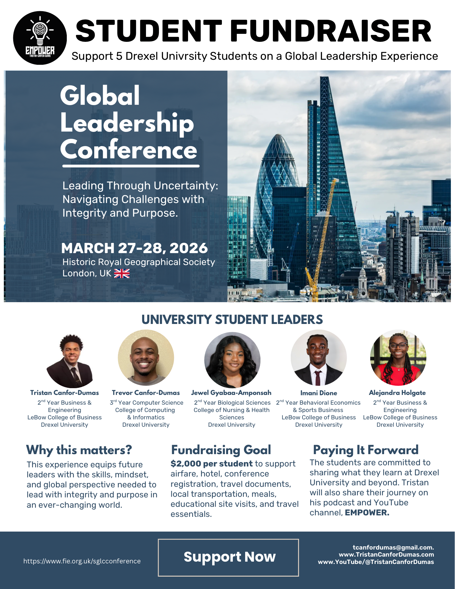 We are raising funds to support five outstanding Drexel University student leaders as they travel to London, UK to attend the Global Leadership Conference at the Historic Royal Geographical Society on March 27–28, 2026.
